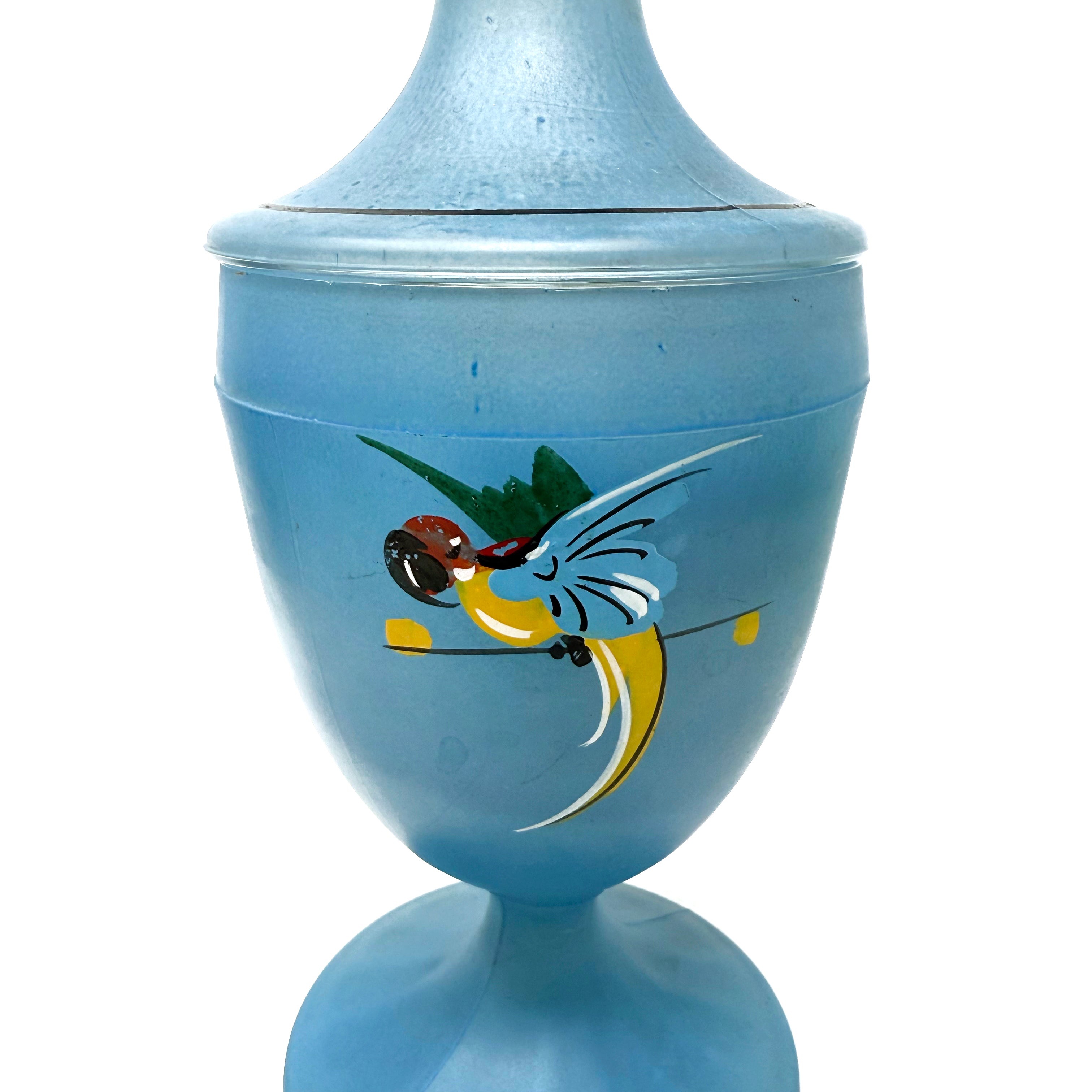 Her delicacy, her poise and that inner glow. She’s a foxy 1930s frosted Fenton glass in blue with a delicate finialed lid. Her hand-painted colorful design make this art À La Carte. Amelie stands 9” tall (lidded) x 4” diameter.