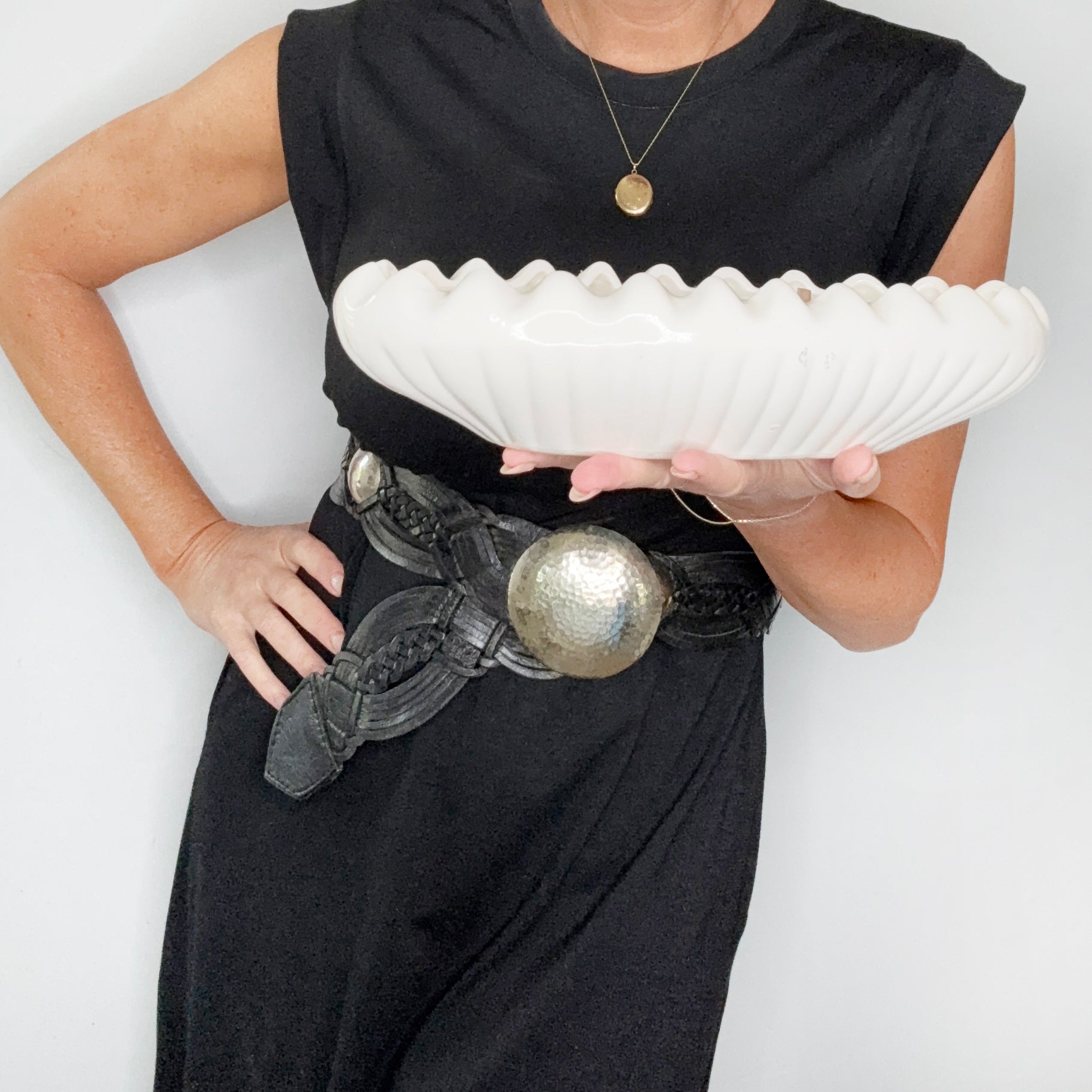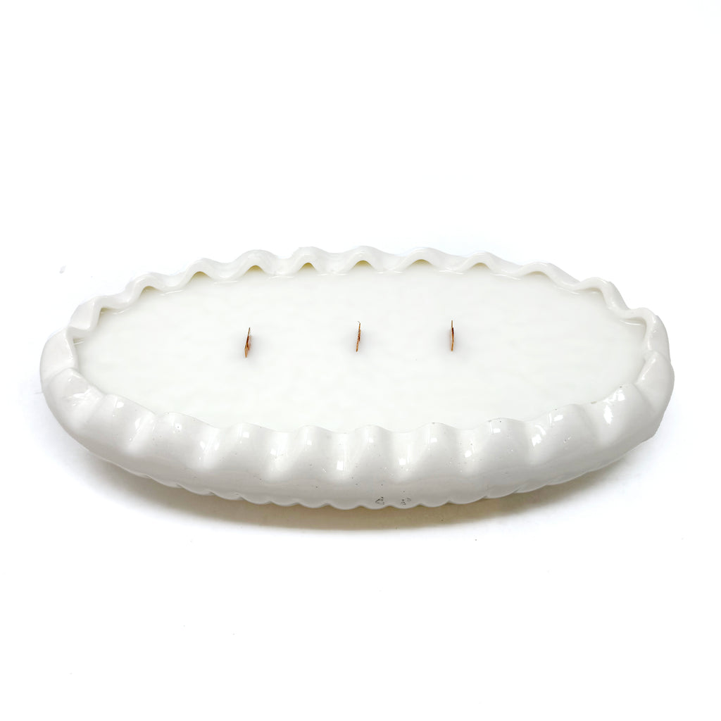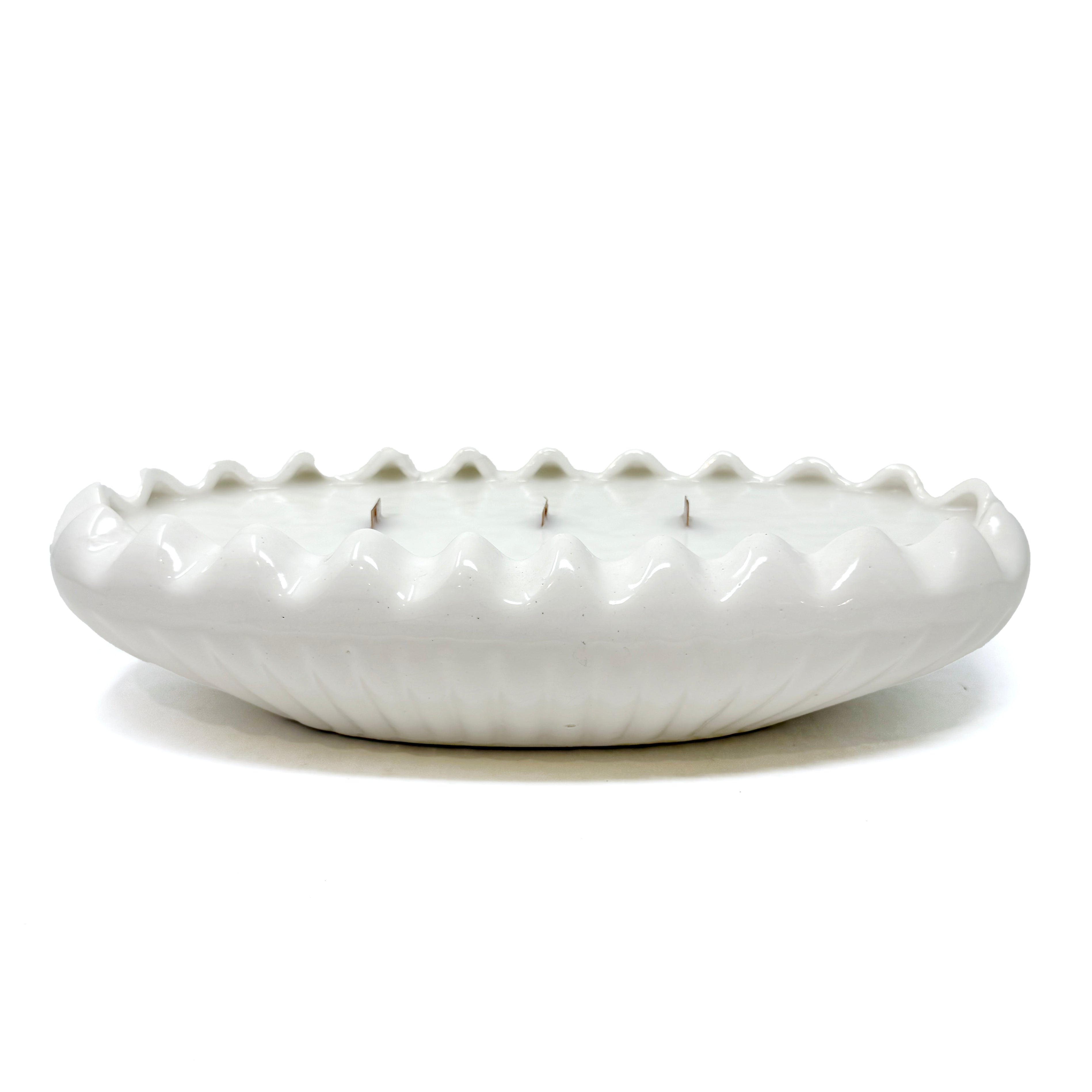 A white hot classic, this crisp ceramic, ruffled edges, and the kind of scale that commands a coffee table. Blanca proves you can be both timeless and a little extra! She holds a huge wax load and dates to the 1950s and measures 12.5" long x 7" wide x 3" tall.