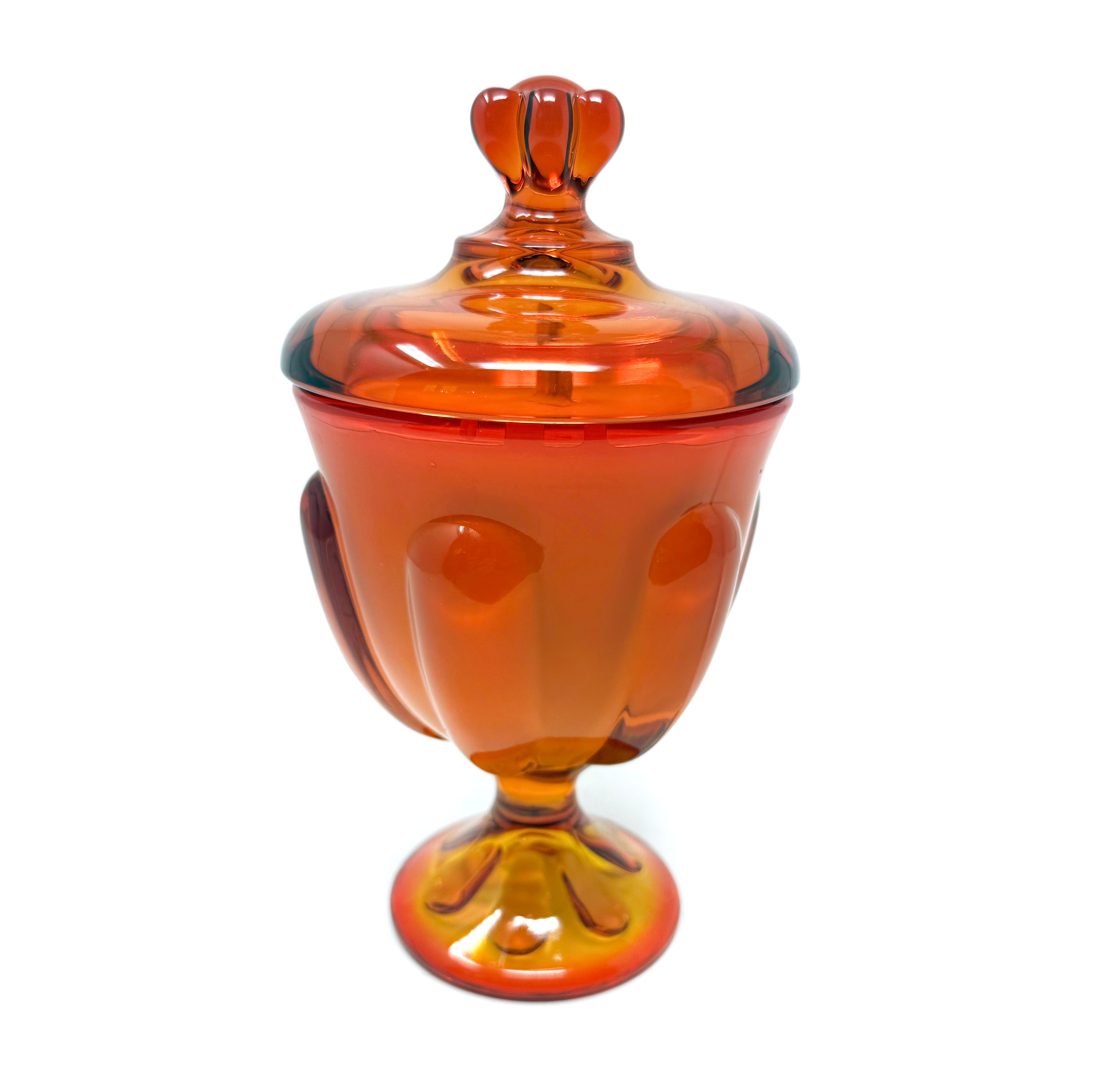 Harvest-ready and heirloom-approved, Miss Emily adds just the right pop of autumn magic to any room! This persimmon beauty is made by the incomporable Viking glass company, dates to the 1960s and measures 8.5 x 4.5