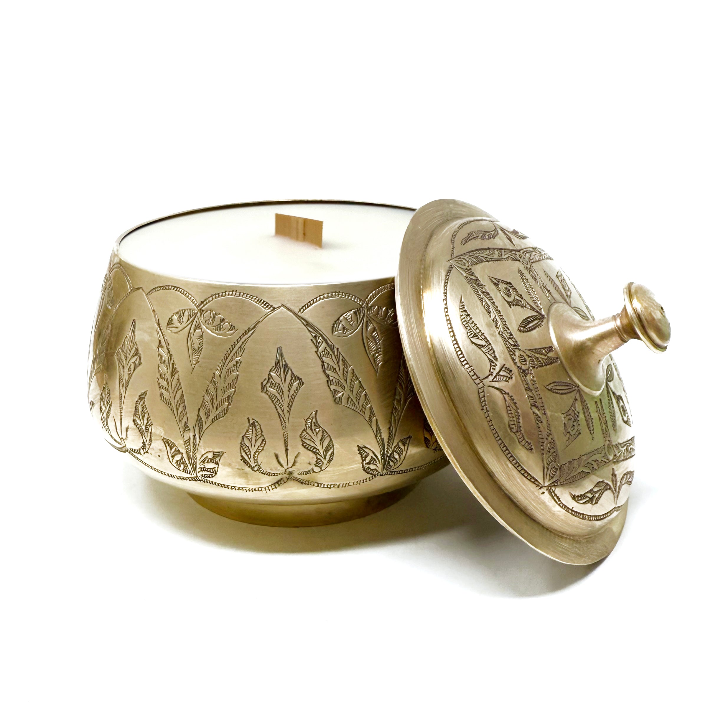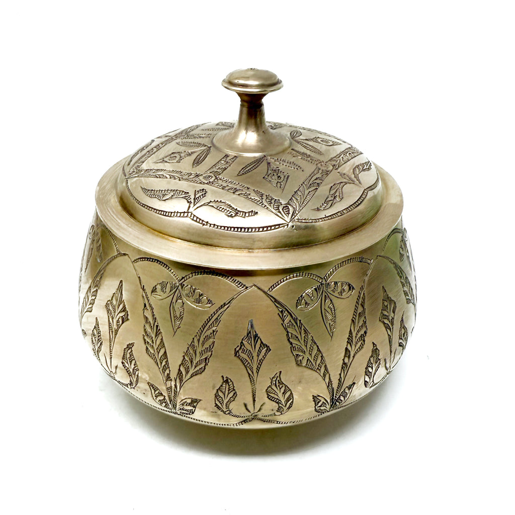 What a golden oldie, Miss Goldie is! Goldie is a gorgeous, etched brass vessel with a lovely floral motif all around. She dates to the 1960s and measures 5" diameter  x 5" tall (lidded).