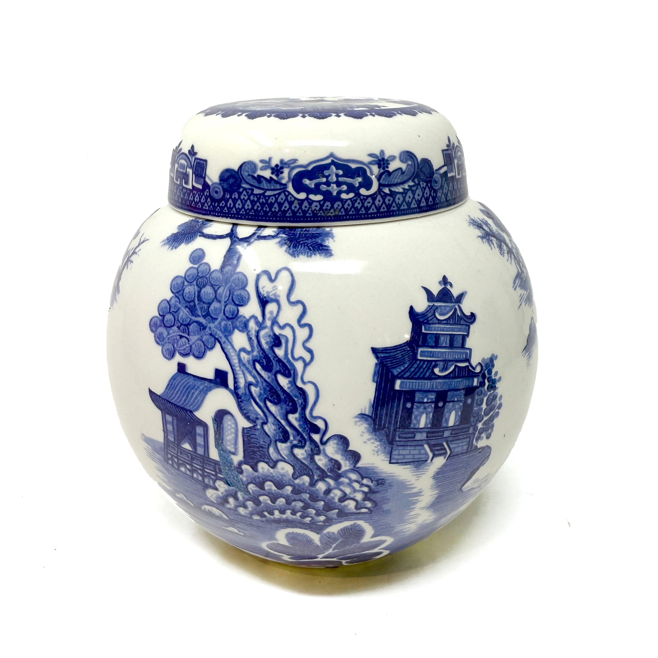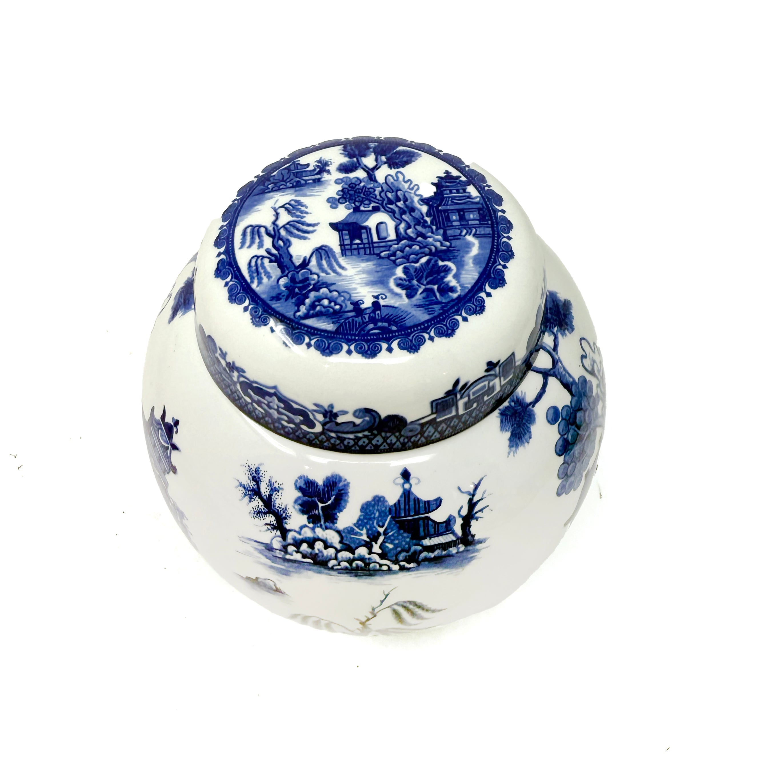 This 1940s blue and white beauty moonlights as a conversation starter—equal parts English charm and globetrotting sophistication, with a swirl of Far East flair! Kim measures 5" diameter x 5.5" tall.