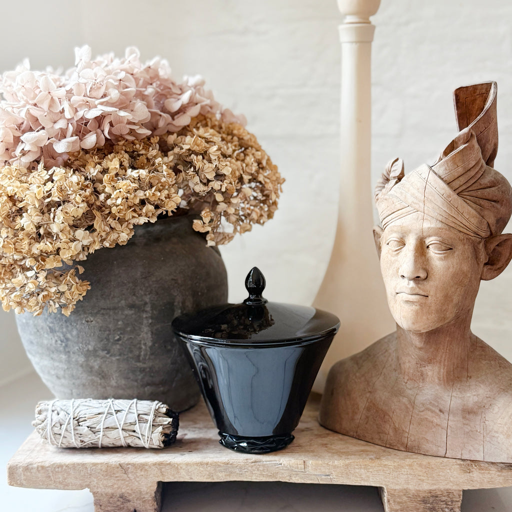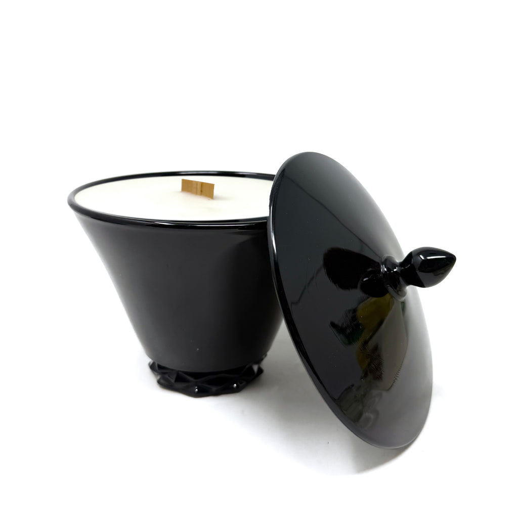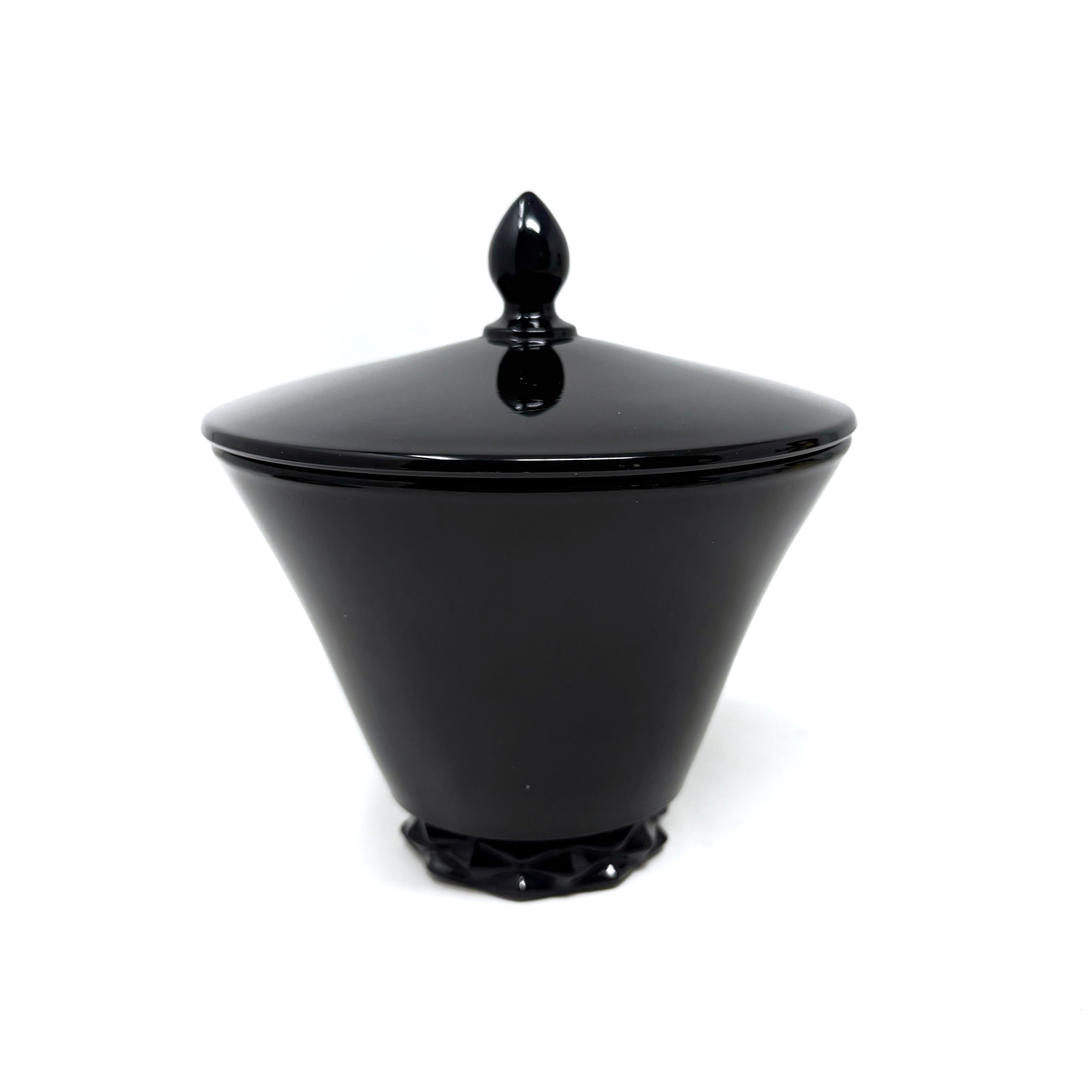 Kira is a super chic 1920s Fostoria ebony glass vessel - sleek perfection in every sense of the word! Perfect for fall / Halloween, she is flawless will blend in seamlessly to any homespace. Kira measures 5" diameter x 6.5" tall (lidded).