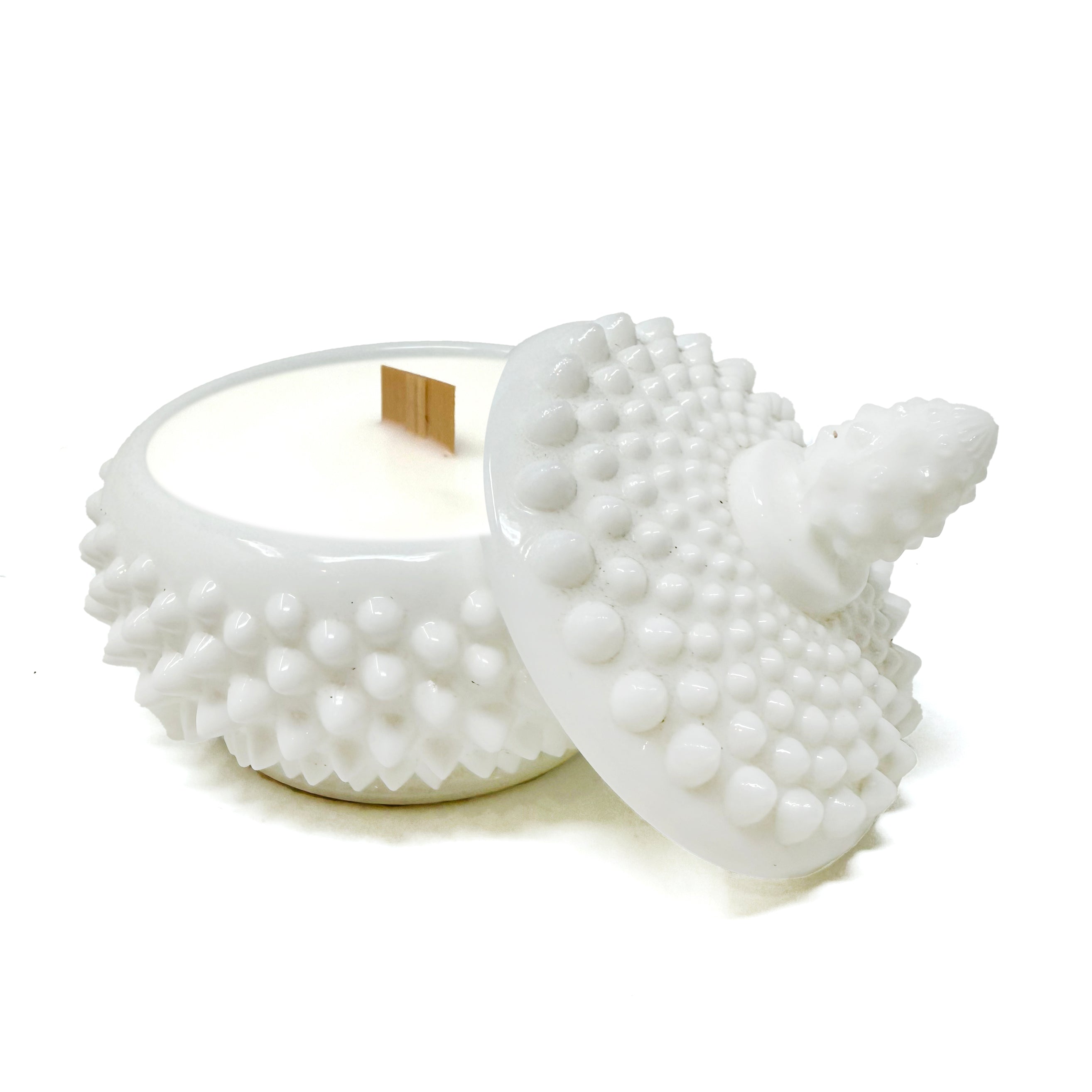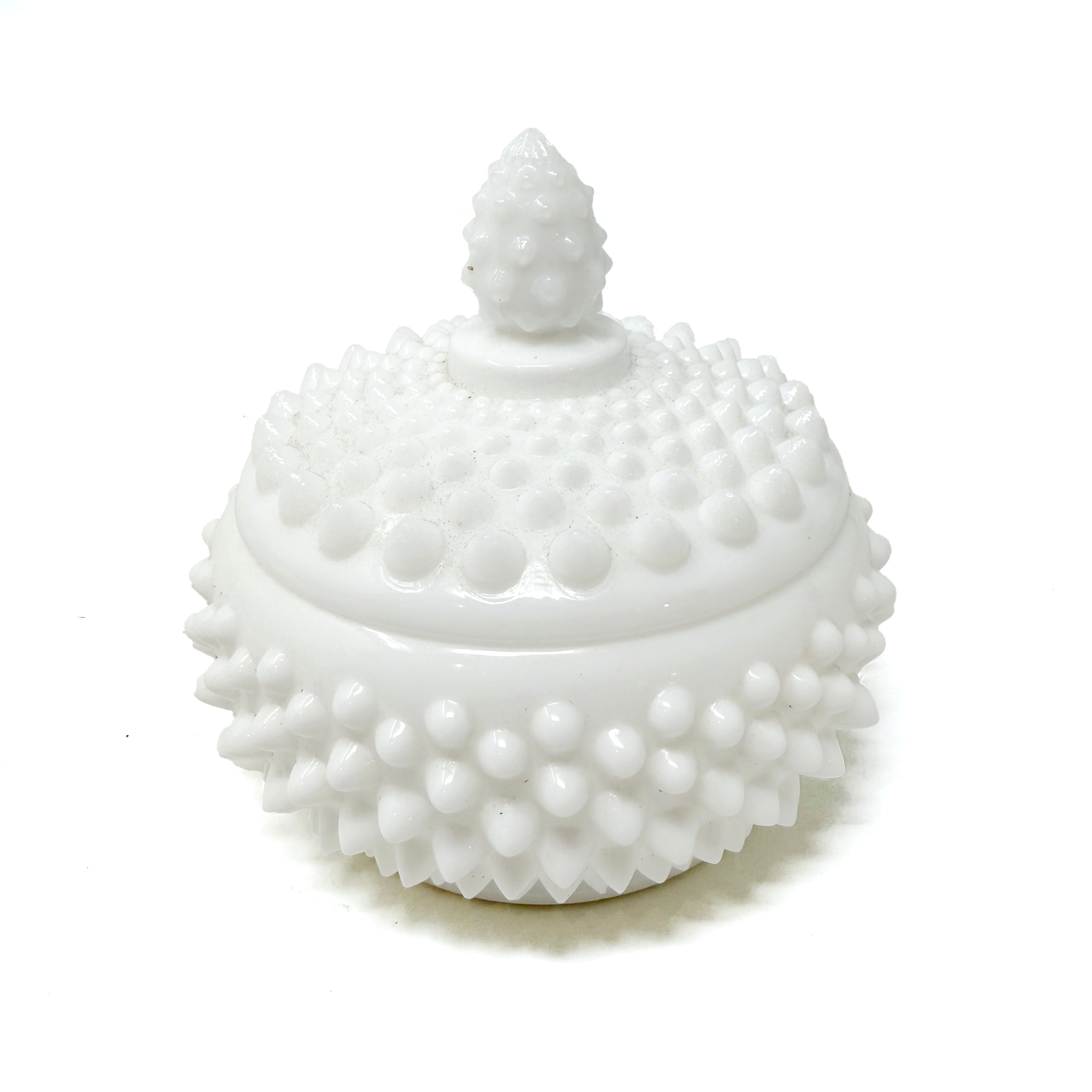 Bringing on the 50s Fenton with this charming petite candle, Miss Raquel!  She dates to the 1950s and measures 4" diameter x 4" tall.