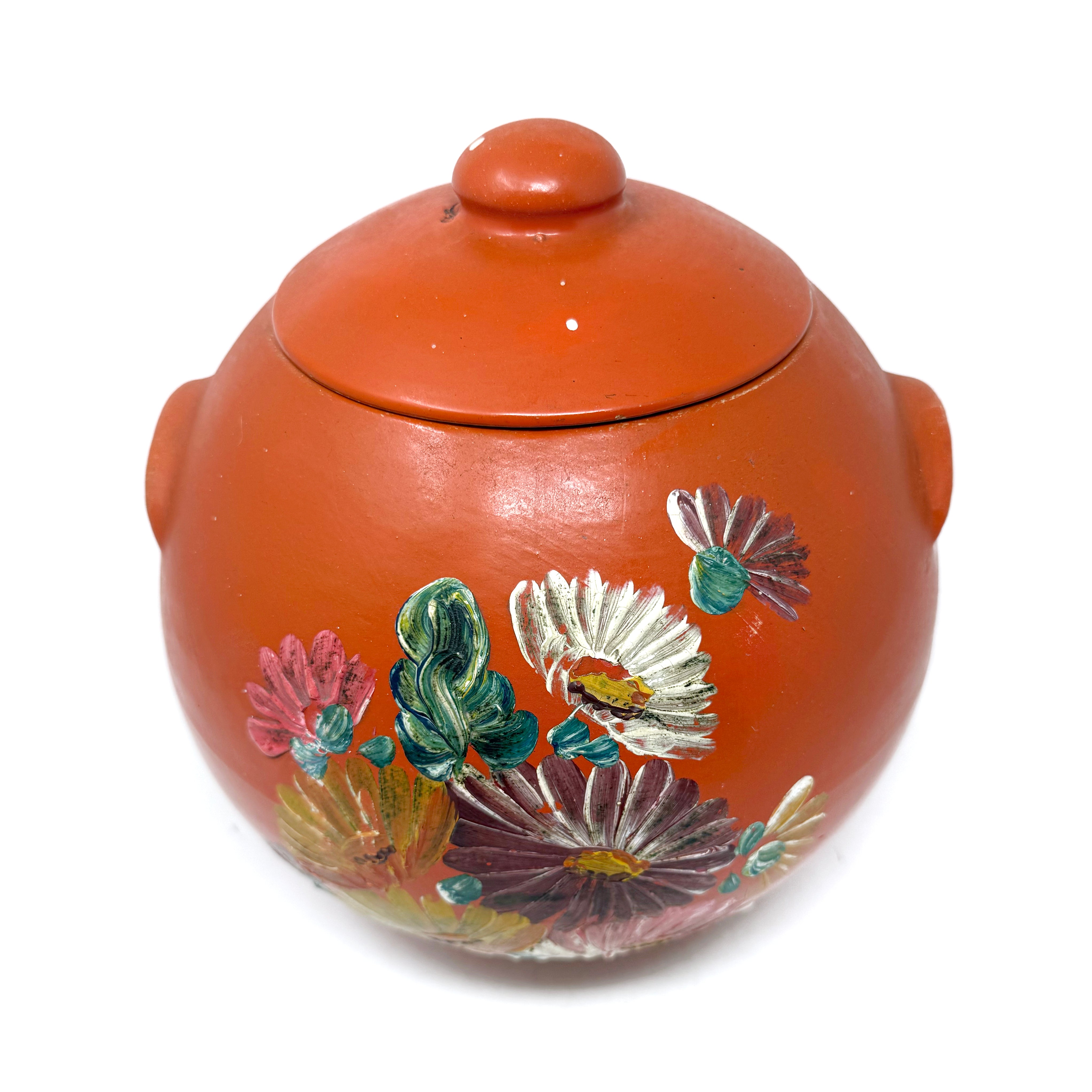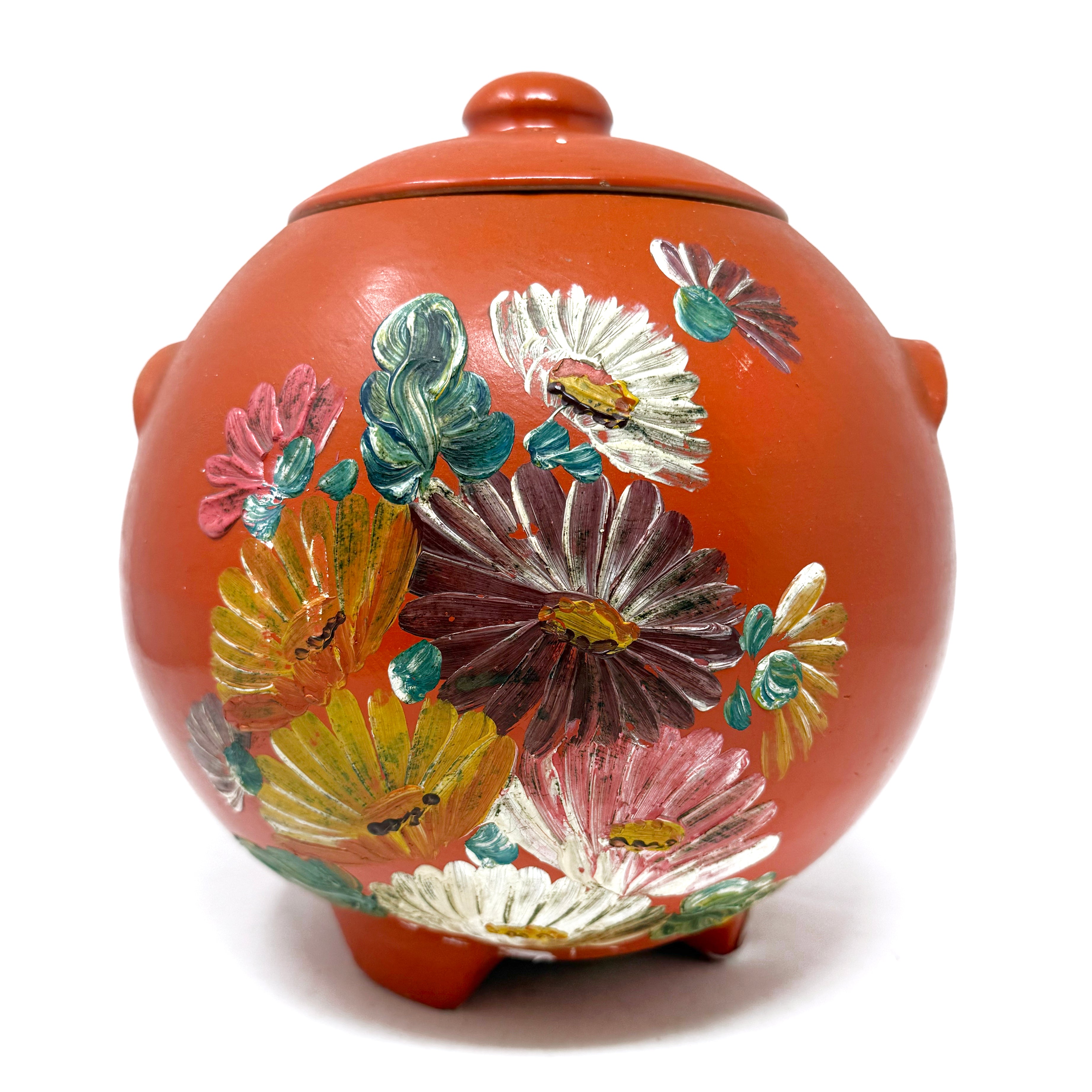 Meet the candle that puts all others to shame. Hand-painted and mid-century marvelous, this Ransburg heavyweight is basically a glowing work of art with a serious wax surplus! Vera measures 8.5" diameter x 8" tall (lidded) and holds a massive wax load!