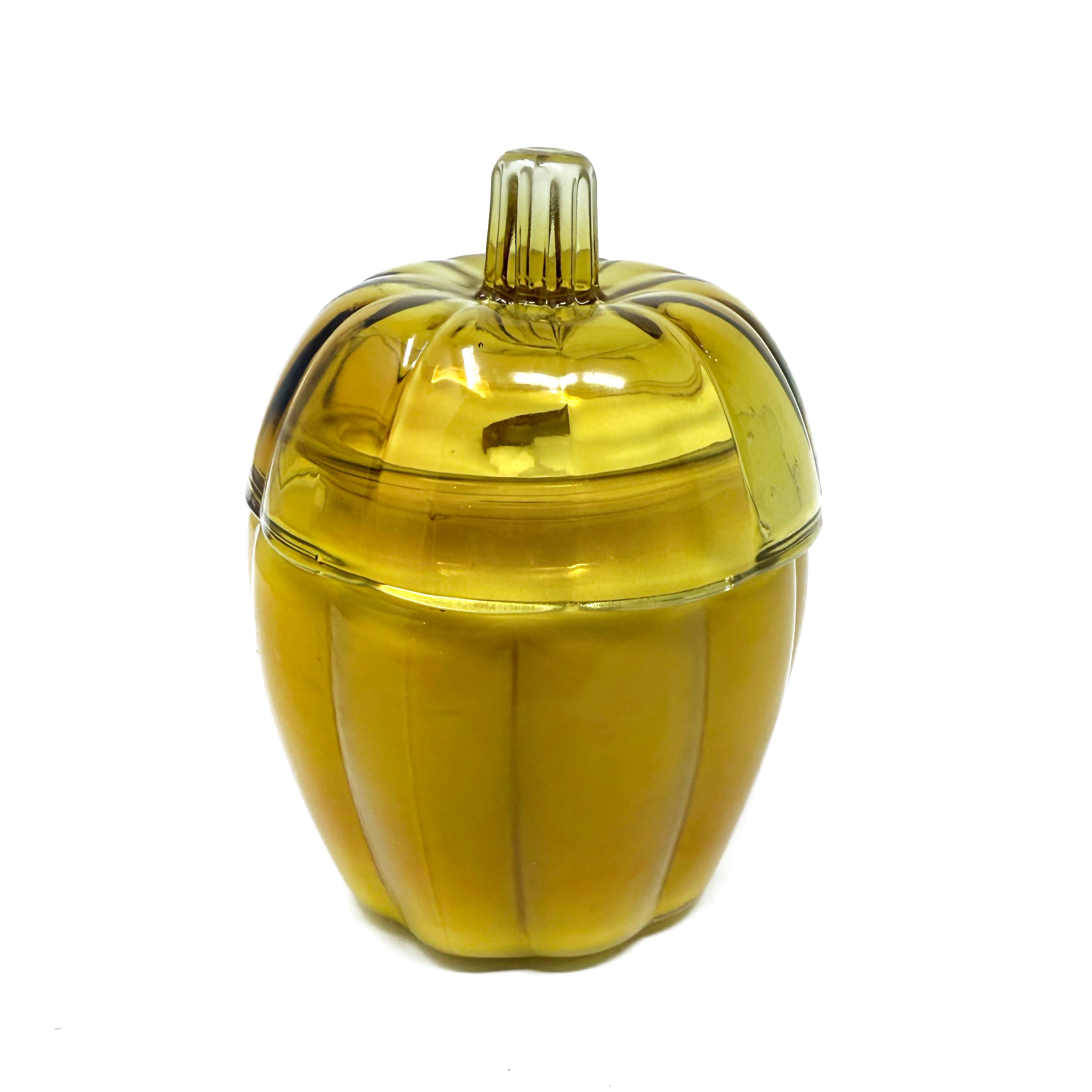 Oh pumpkin, you’re gonna love Patricia! This sweet amber glass pumpkin is sure to add some spice to your fall. Patricia measures 5.5” tall (lidded) x 4” diameter and dates to the 1970s.