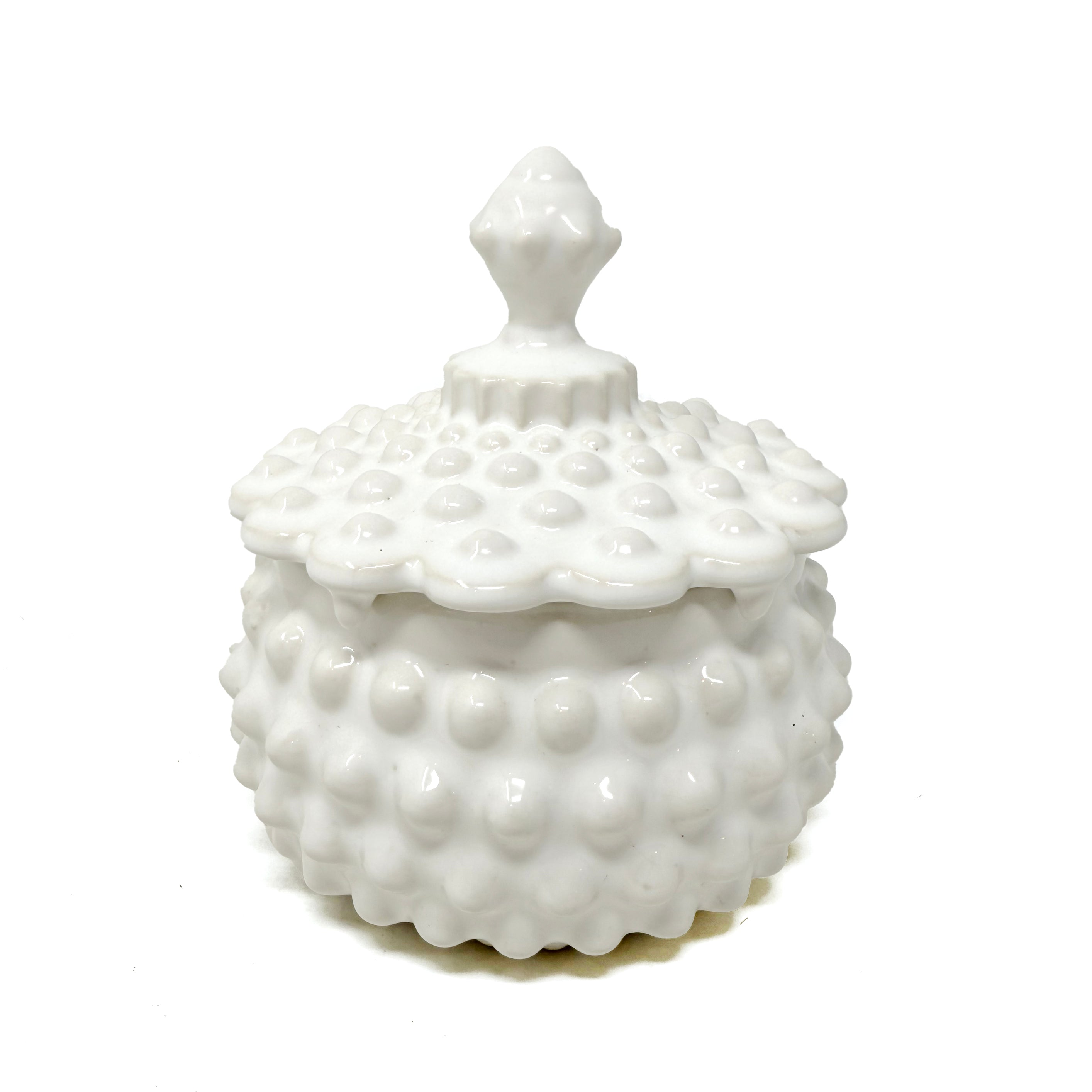 Miss Raquel is a lovely white ceramic hobnail piece dating to the 1980s - perfectly neutral for any homespace!  She measures 4.5" diameter x 5.5" tall (lidded).