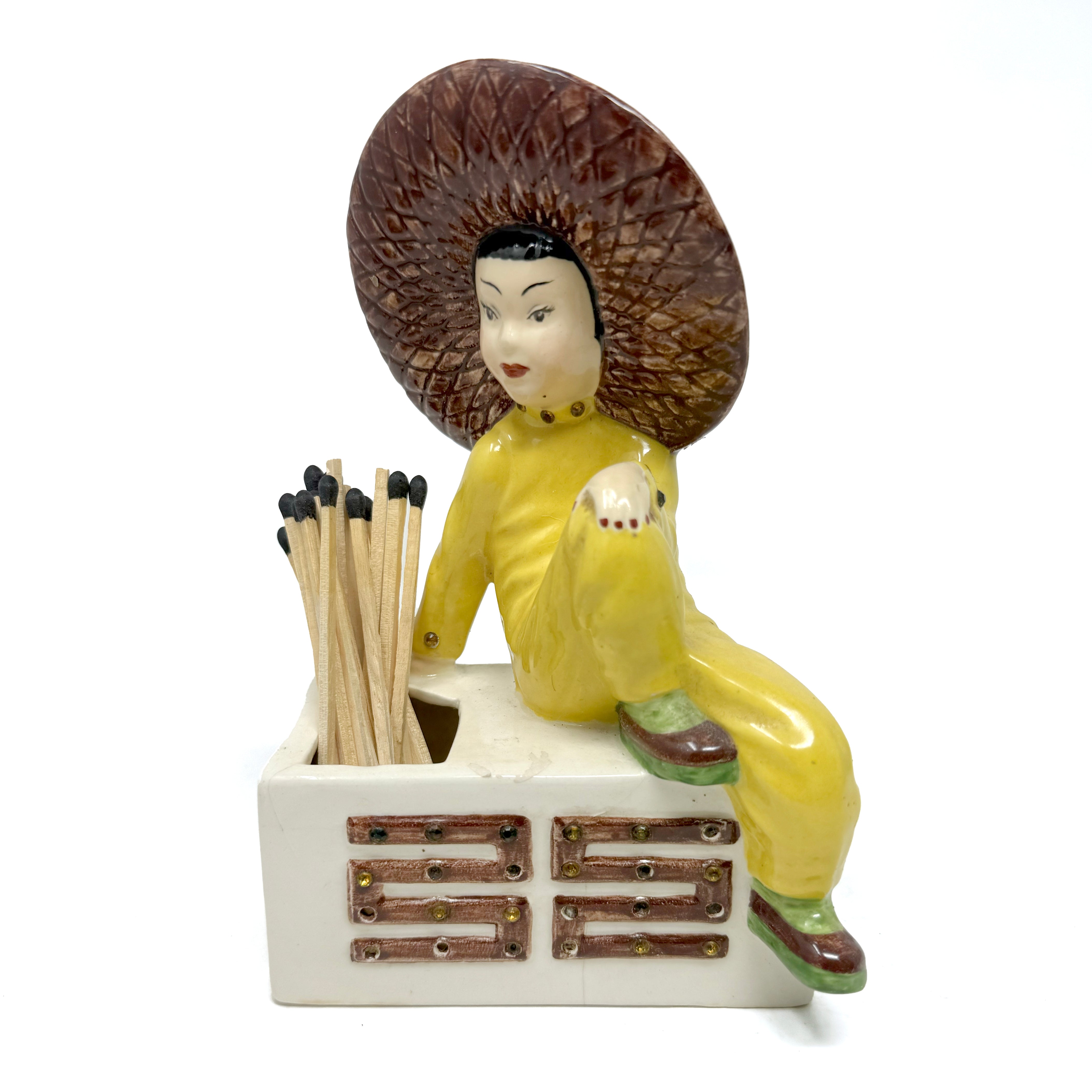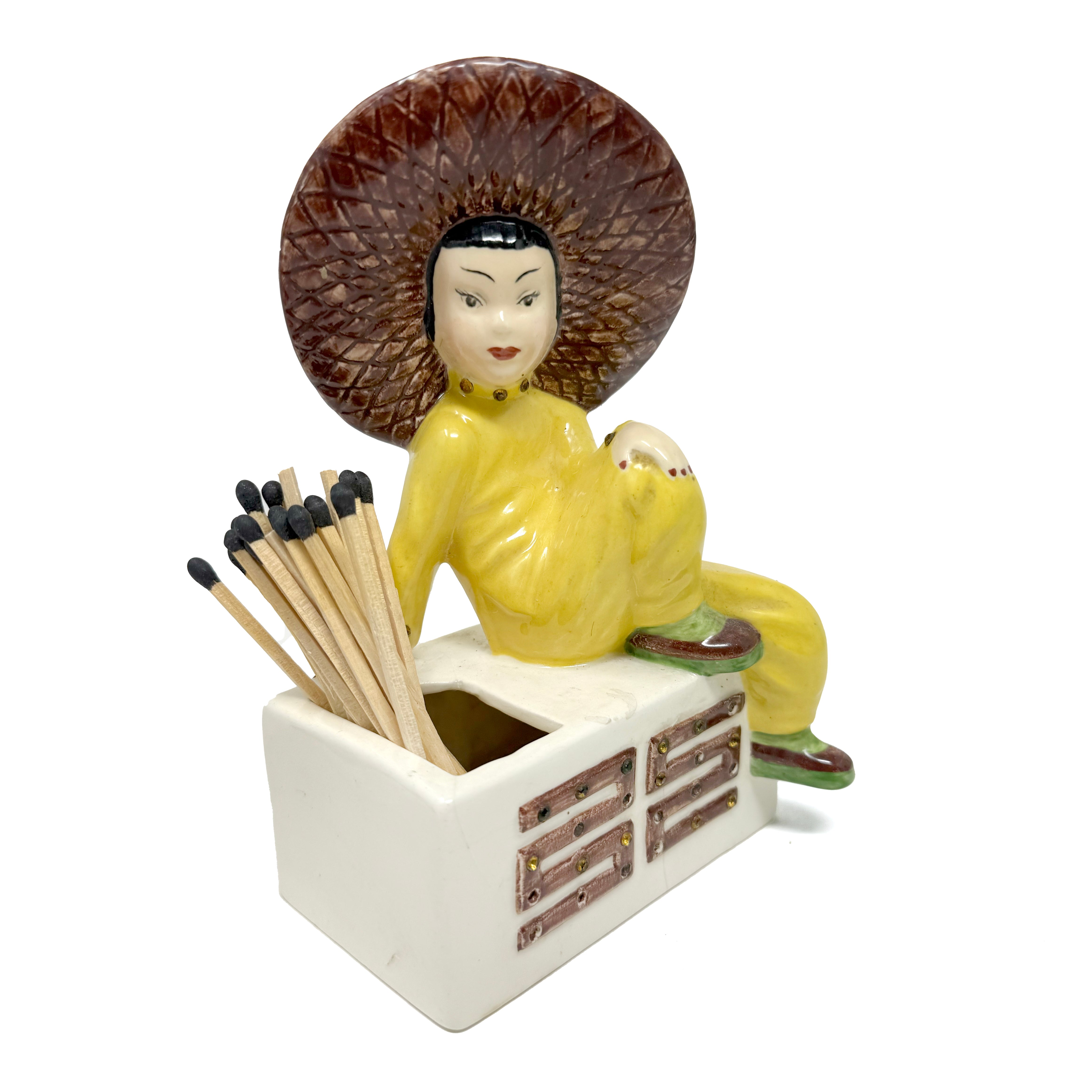 She may be small, but she's striking! This 1950s match holder featuring a poised beauty is more than a utility piece—she's mid-century charm with a huge spark of personality. Hina holds a large set of 4" matches and has a "strike anywhere" surface on her base.