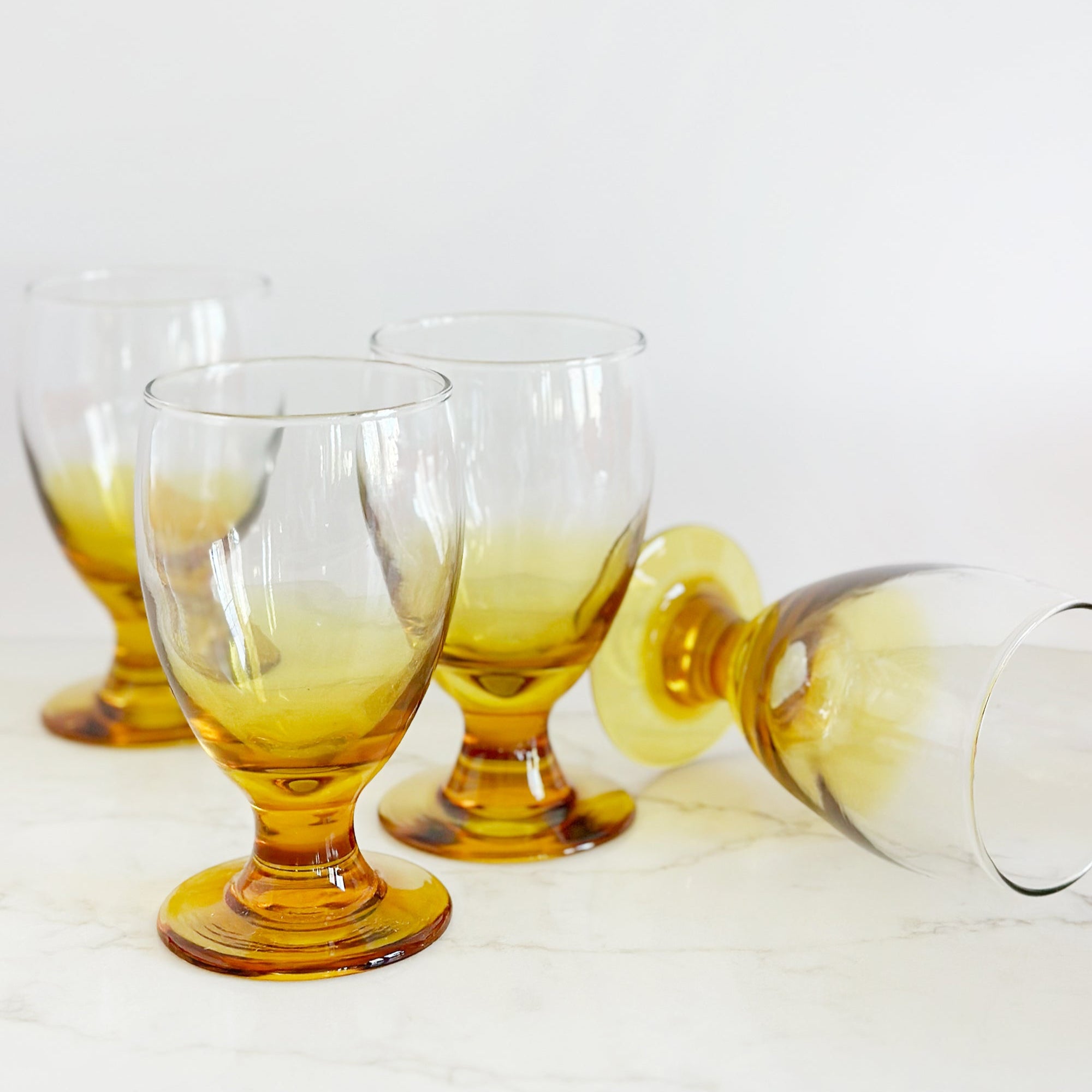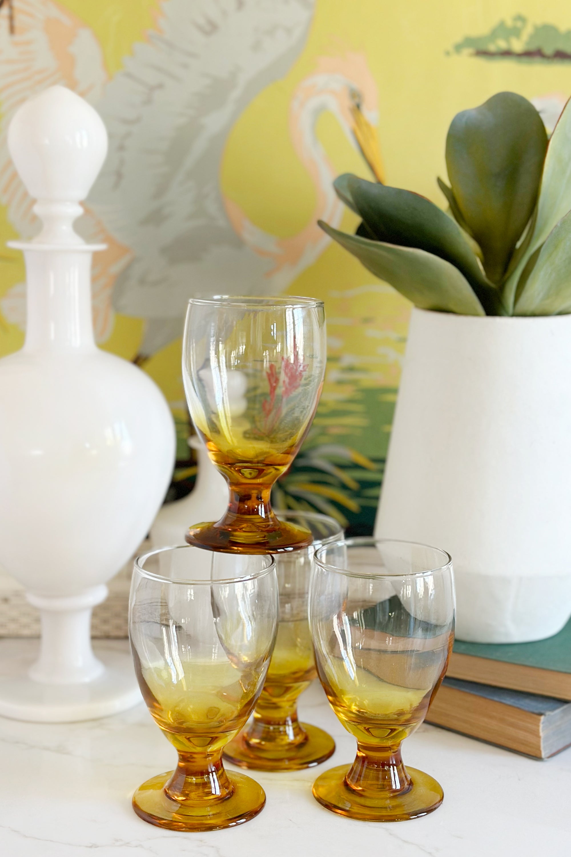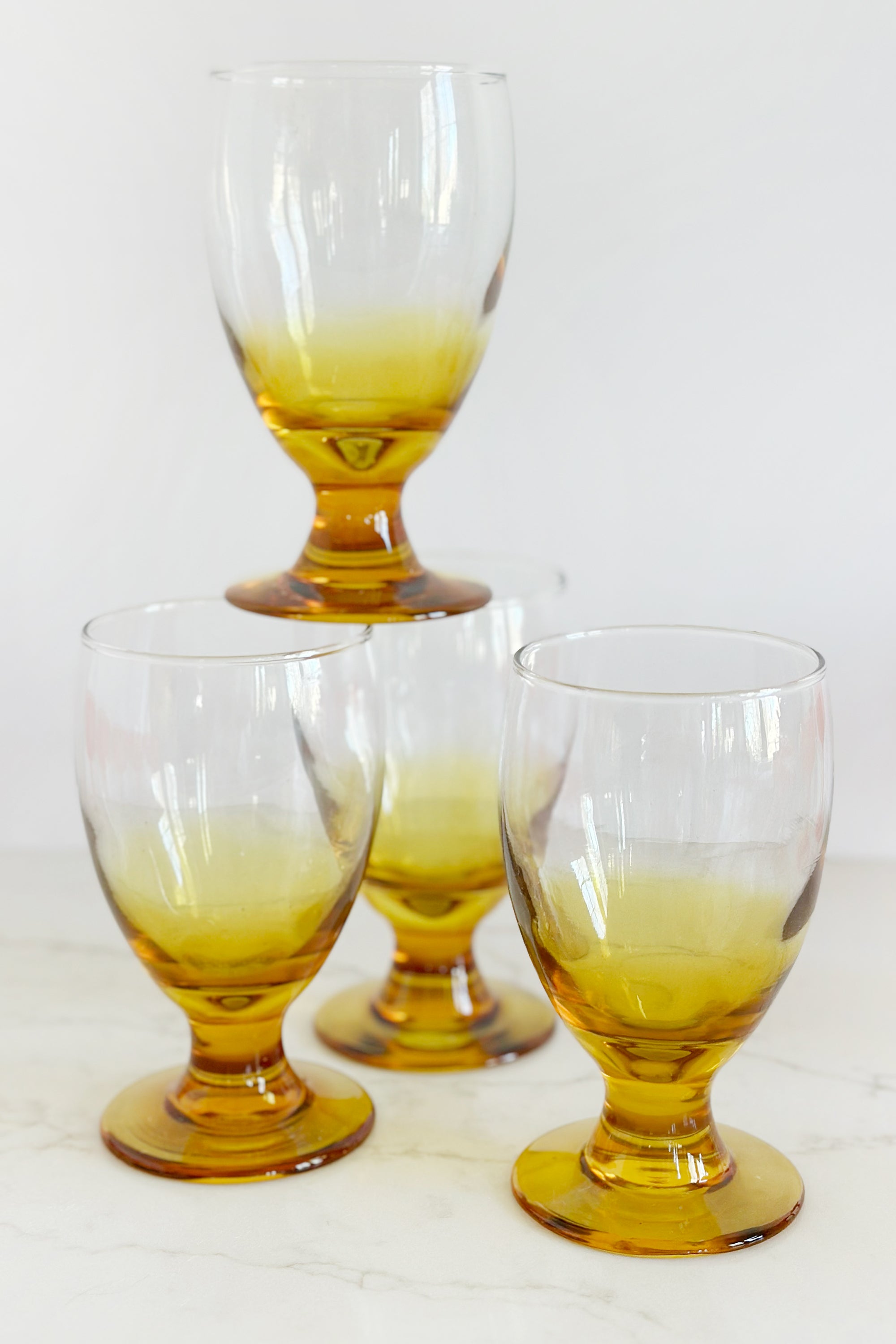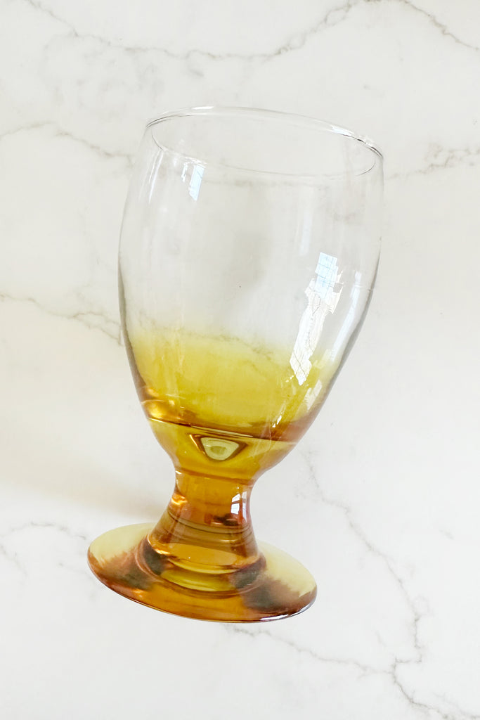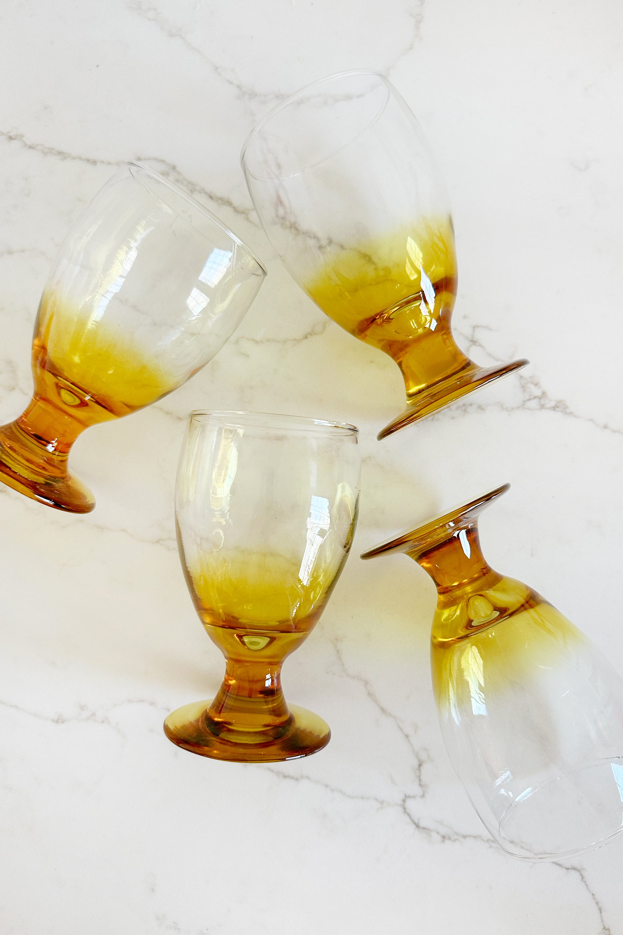 These 1960s ombre yellow pedestal glasses bring a golden-hour glow to every sip. With their warm fade and retro charm, they’re perfect for cocktails, lemonade, or simply making your glassware collection radiate with vintage flair. Each glass measures 3" diameter x 5.5" tall.