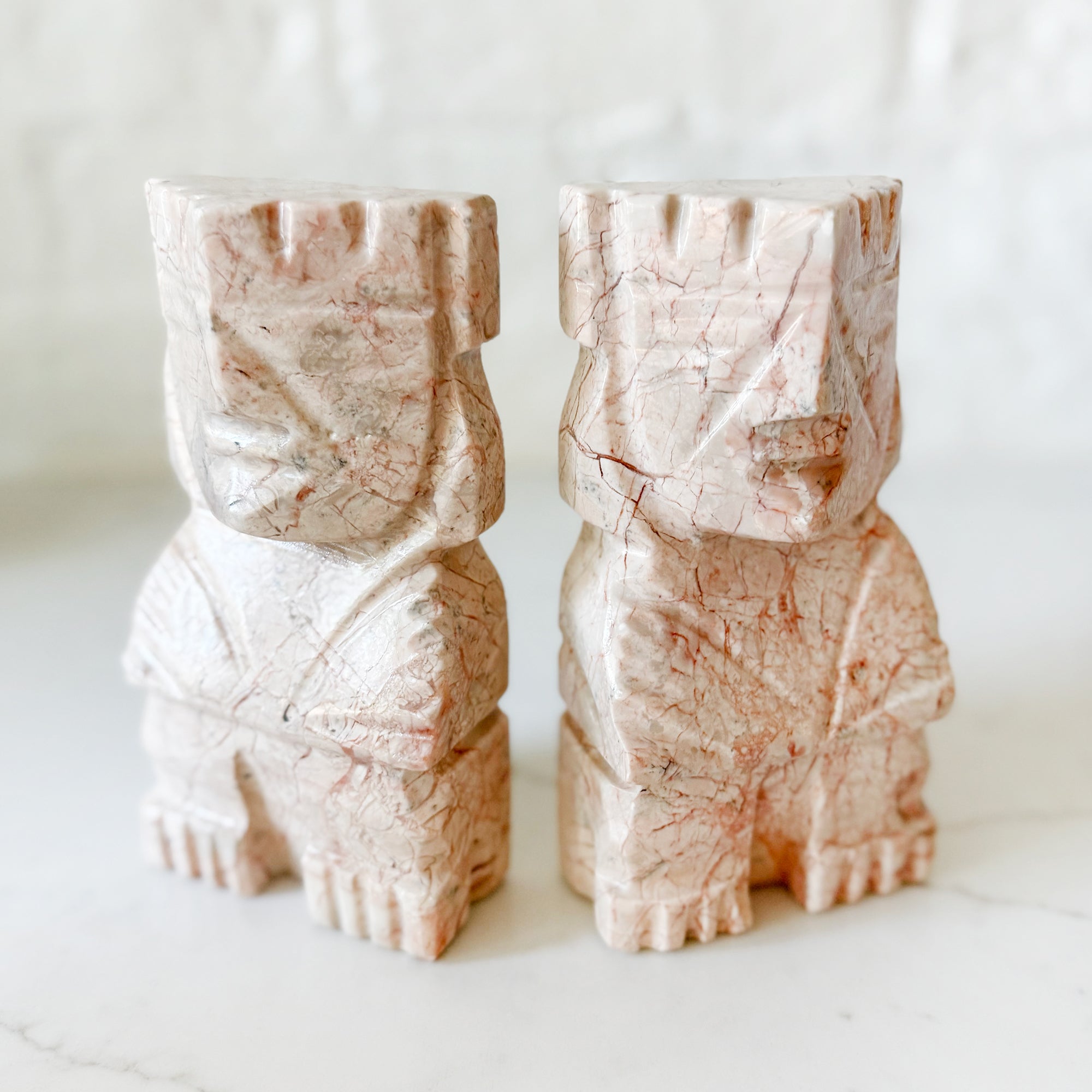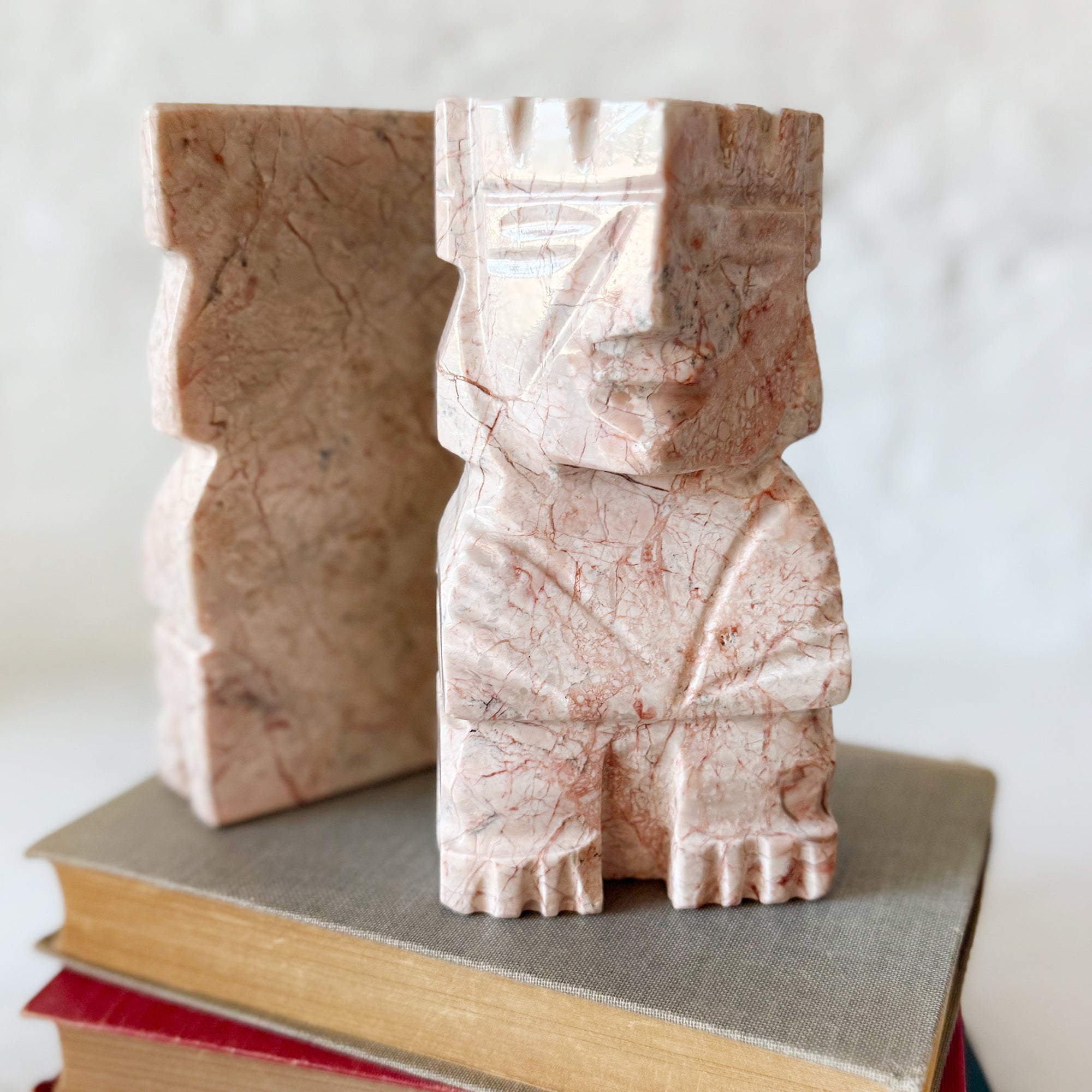 Because your books deserve a vacation. These 1960s marble pink tiki bookends bring tropical attitude and mid-century swagger to your shelfscape! Kitschy and collectible, this heavy set measures 6" tall.