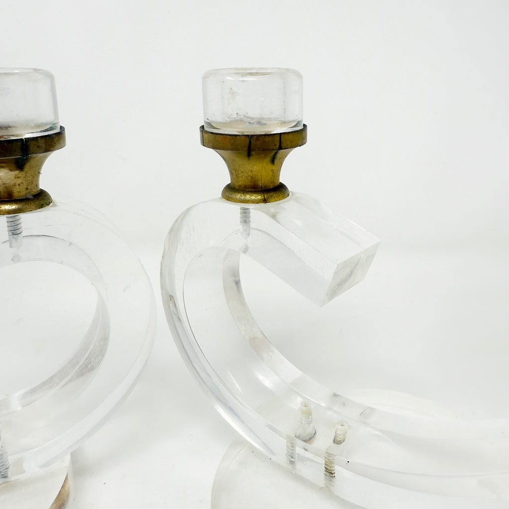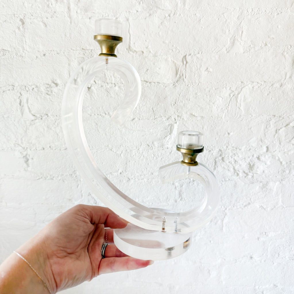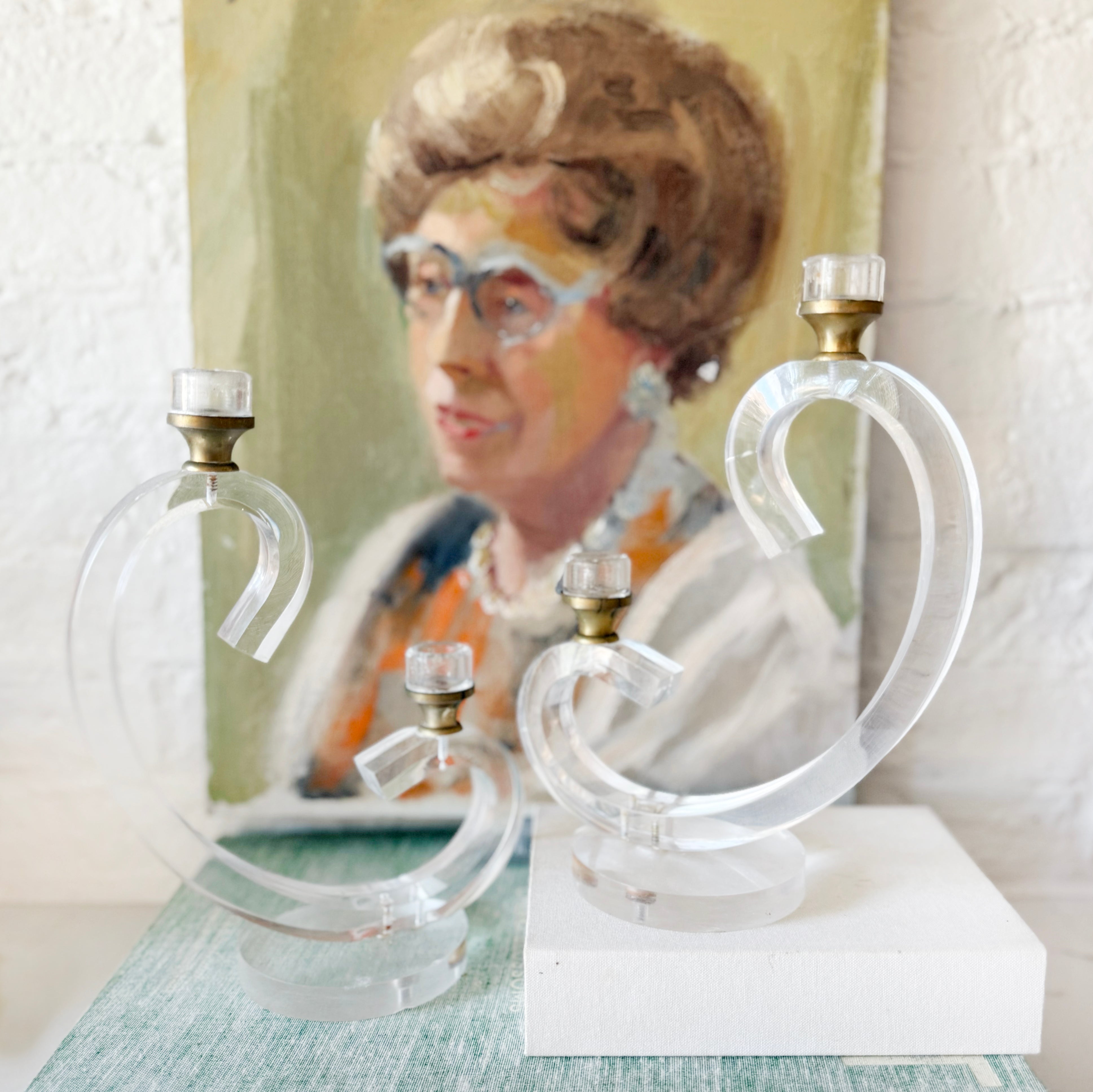 Architectural, elegant, and just obscure enough to make collectors do a double take, this MCM Spanish Lucite candlestick set isn’t here to blend in. They're here to anchor your tablescape, your bookshelf, or that vignette you keep rearranging. Transparent? Yes. Invisible? Never. Please note that this special set have some minor flaws, lending to their age and their uniqueness. A truly rare and special set, Alana & Bella will indeed increase in value!