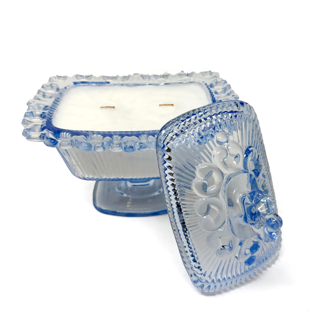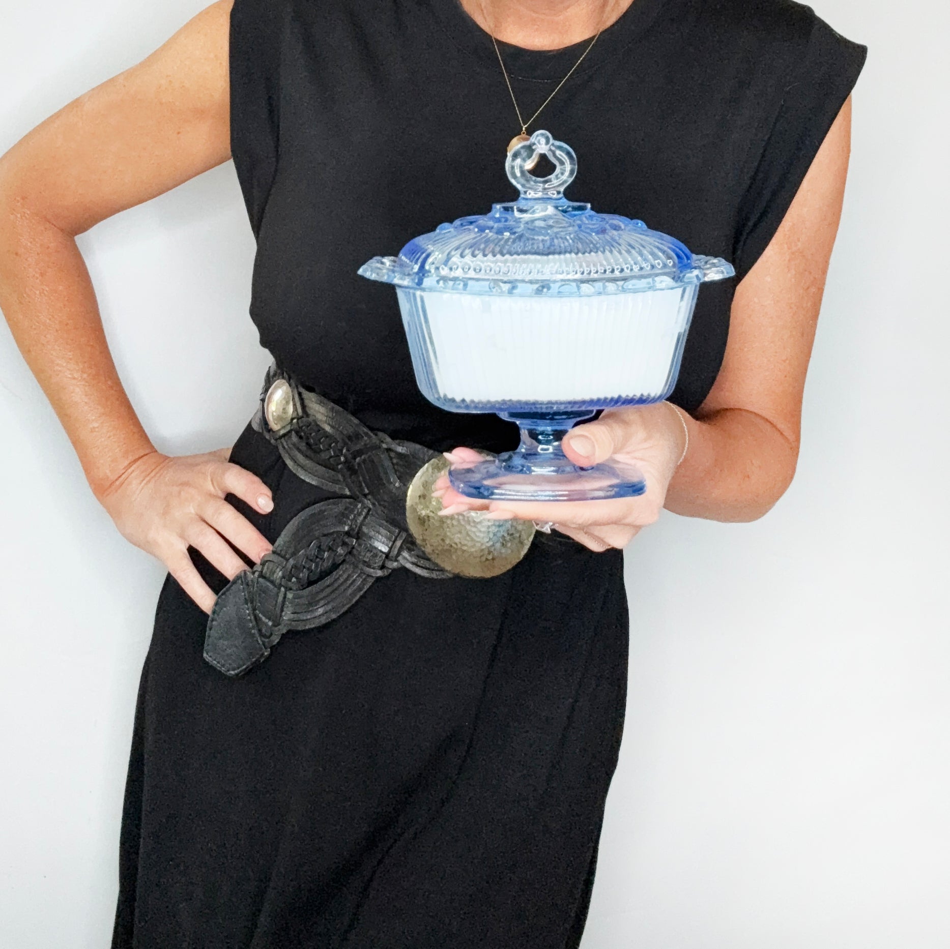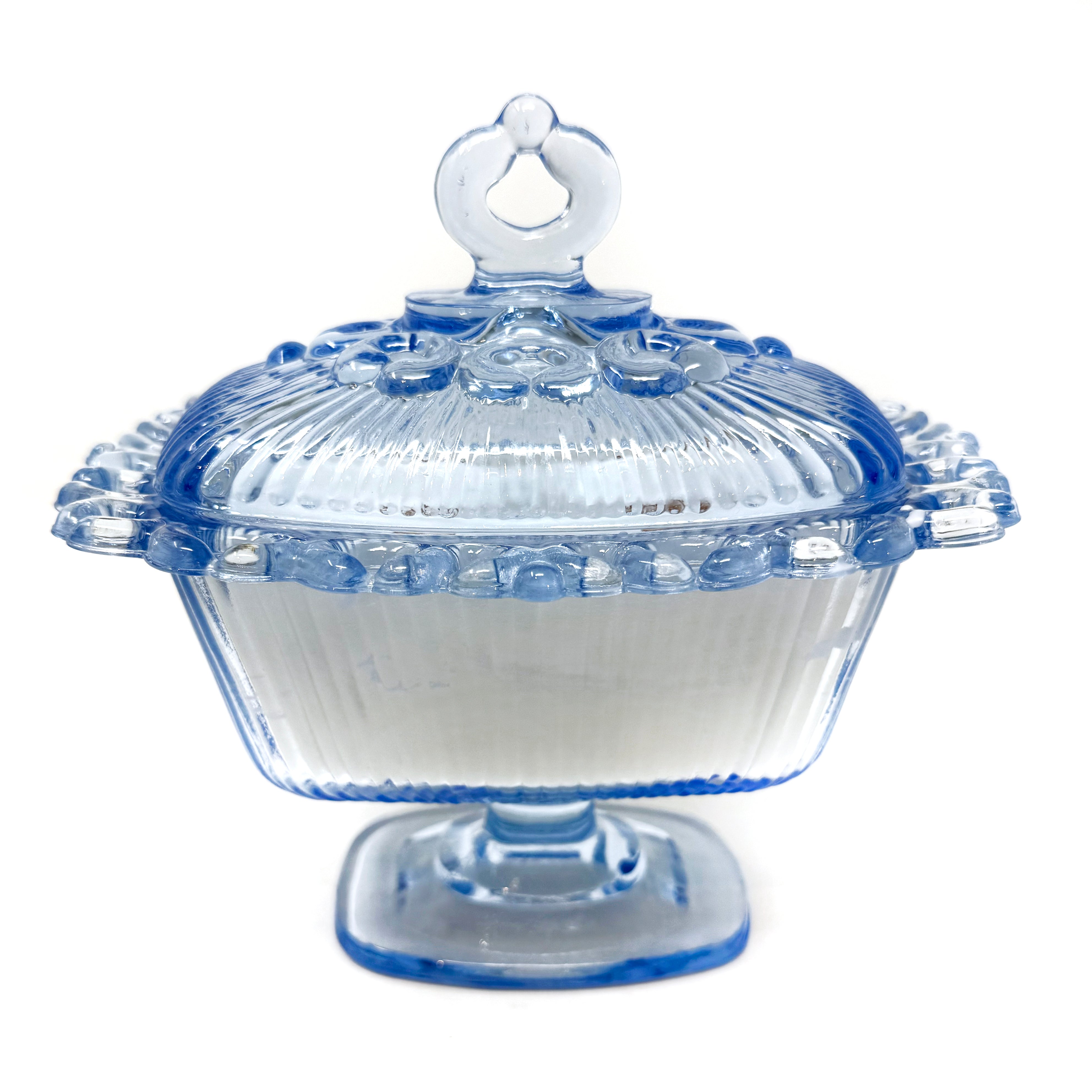 Her delicacy, her poise and that inner glow! She’s an Imperial depression glass "colony lace" vessel. Autumn's fine ribbed design and sweet disposition makes for some serious eye candy. She’s rare and highly collectible! Autumn measures 7" long x 4.5" deep x 7.5" tall (lidded).