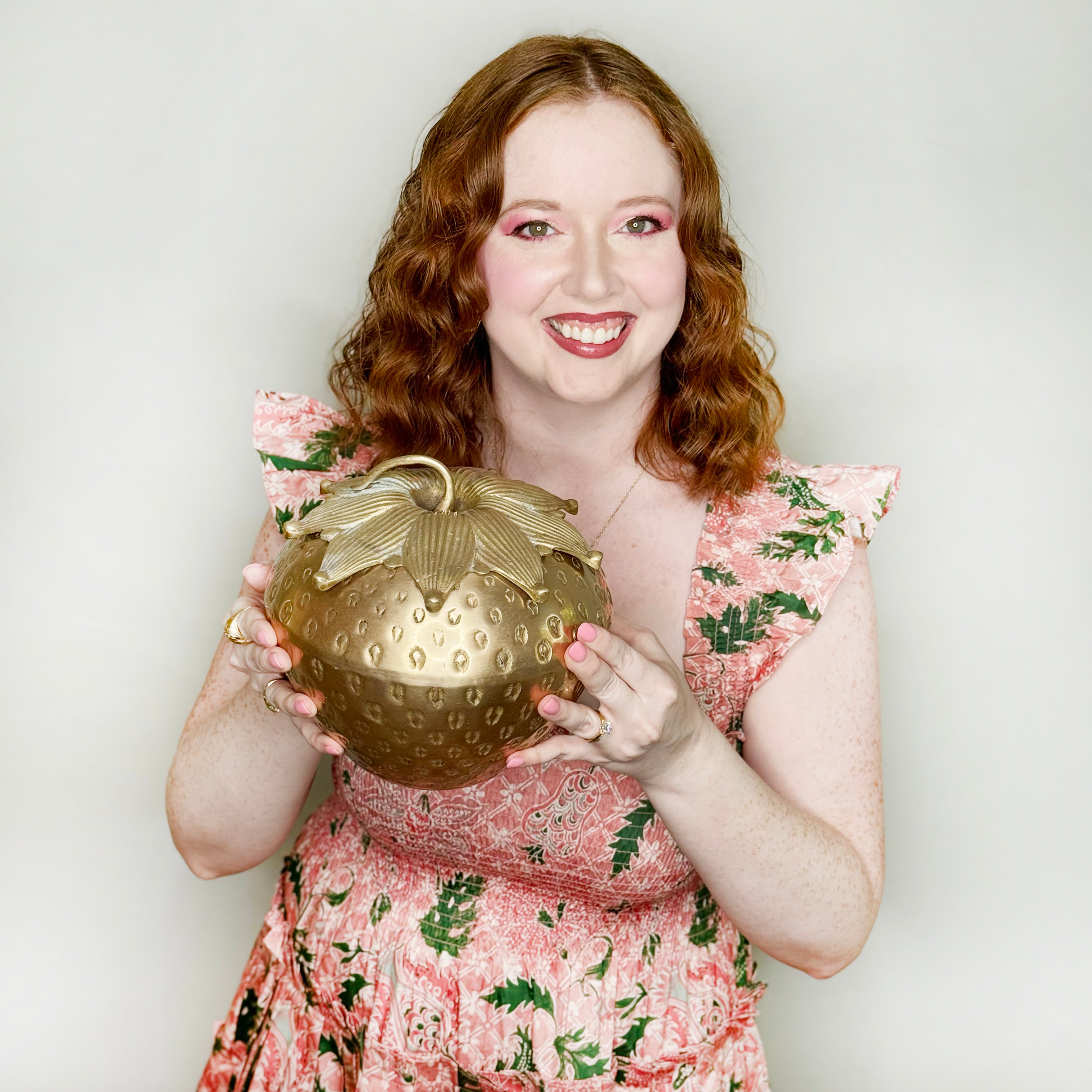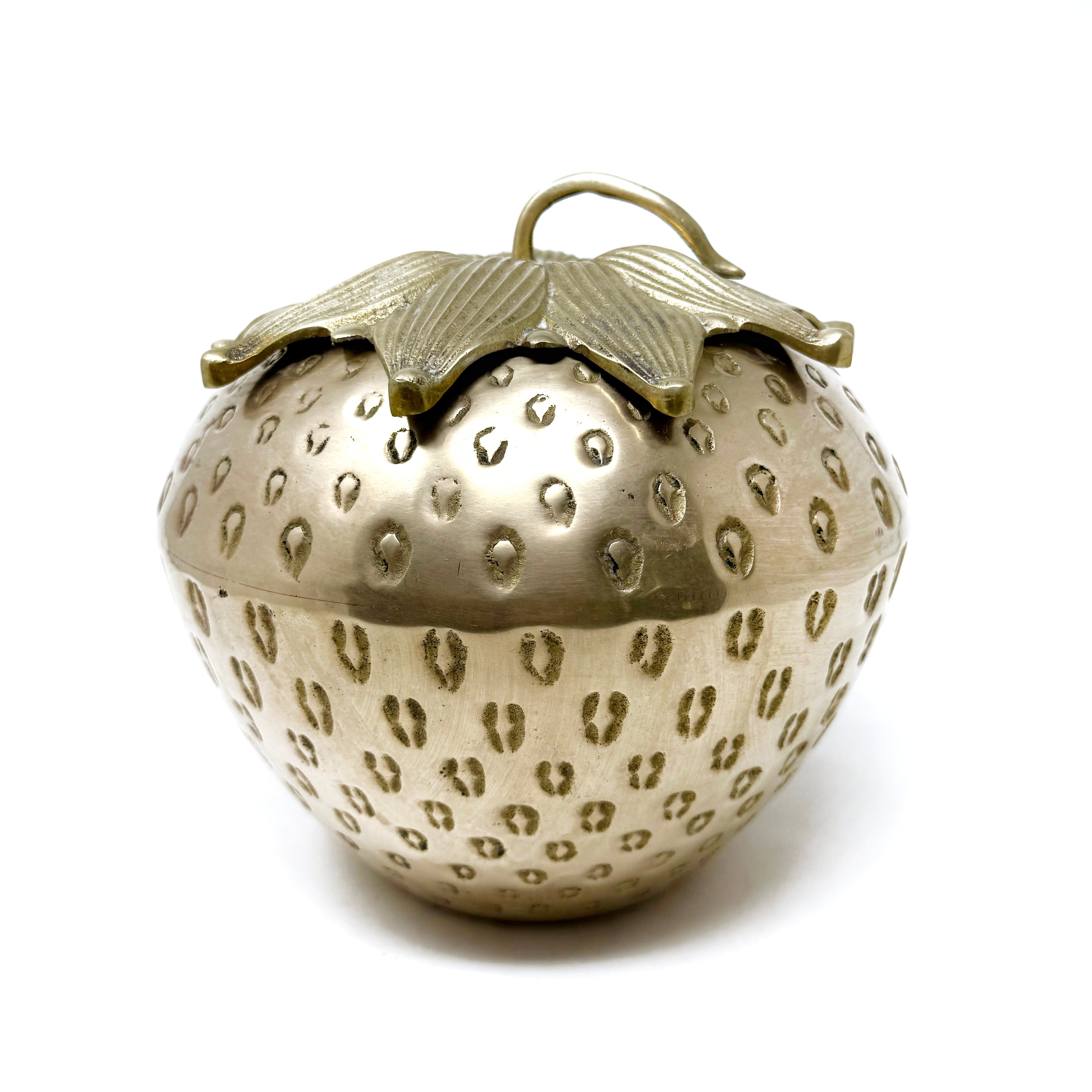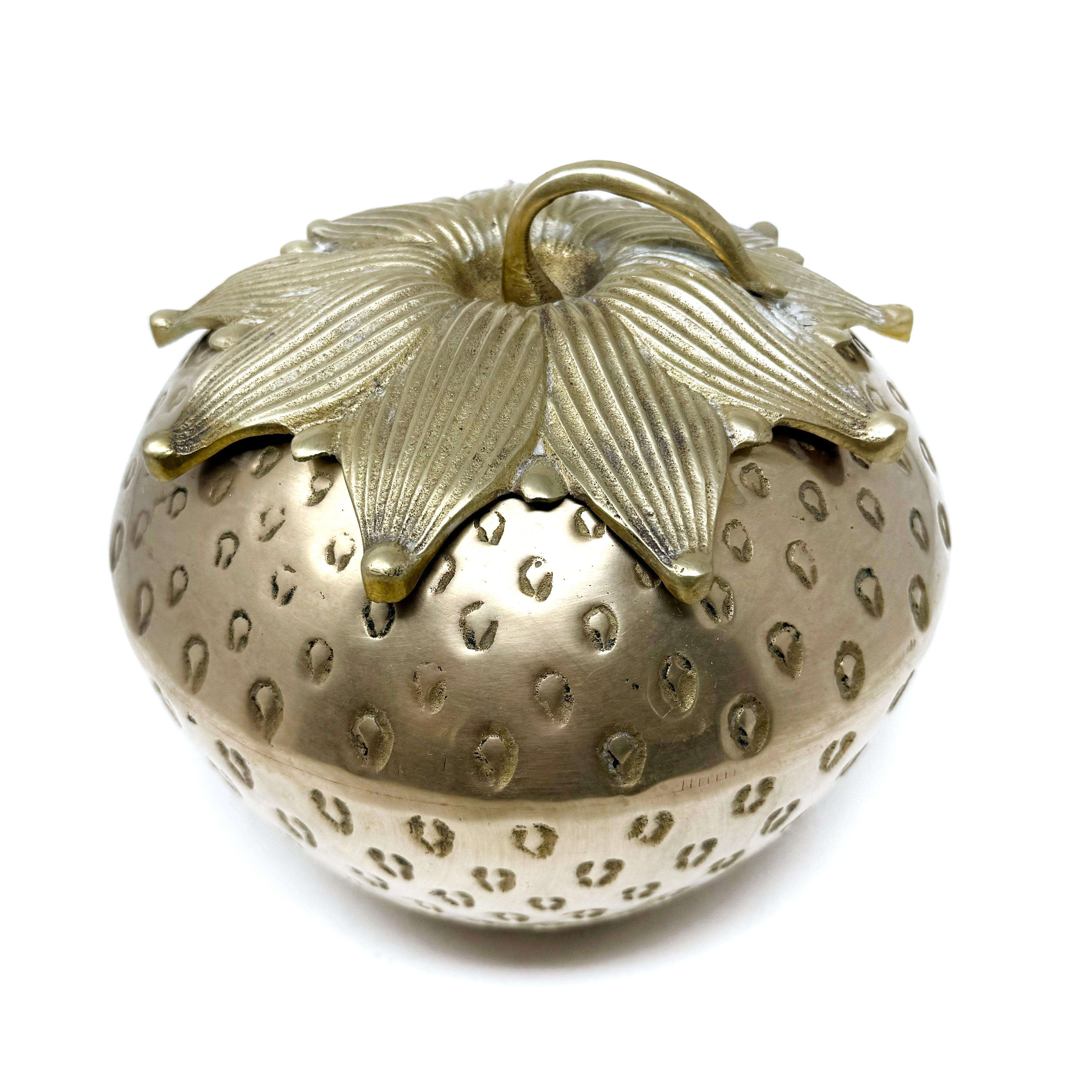 I would consider this to be the crown jewel of this collaboration. I have never found a brass strawberry this large. Its size, presence and beauty truly cannot be overstated. Caitlin dates to the 1960s and measures 9" diameter x 7.5" tall (lidded).