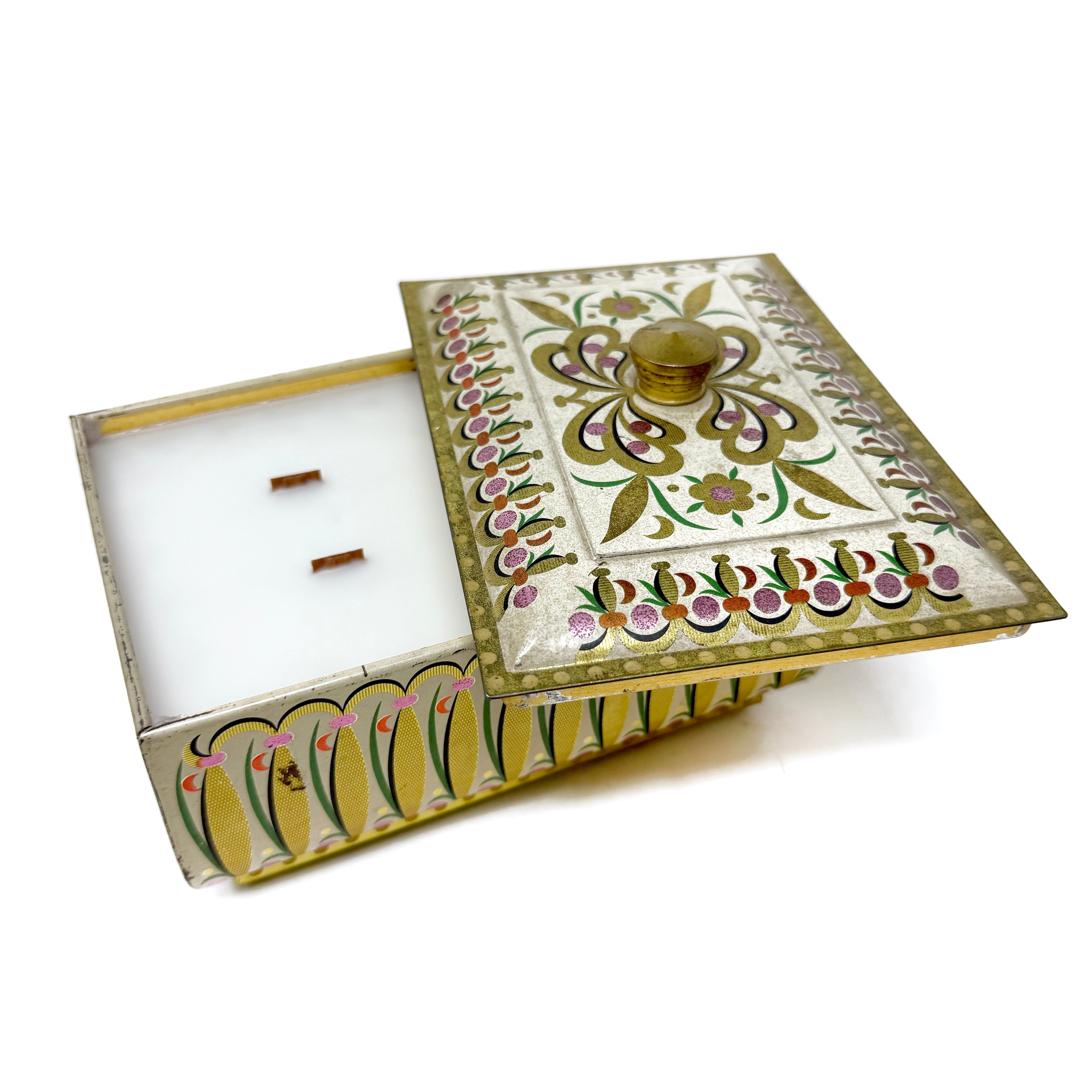Cecelia is vintage, yes—but with colors and shapes so fresh it could easily be the centerpiece of a modern gallery wall. She is the kind of piece that sparks conversation before you even light it!  Cecelia measures 6.5" long x 3.5" tall (lidded) and holds a nice, large wax load making for a long burn time.