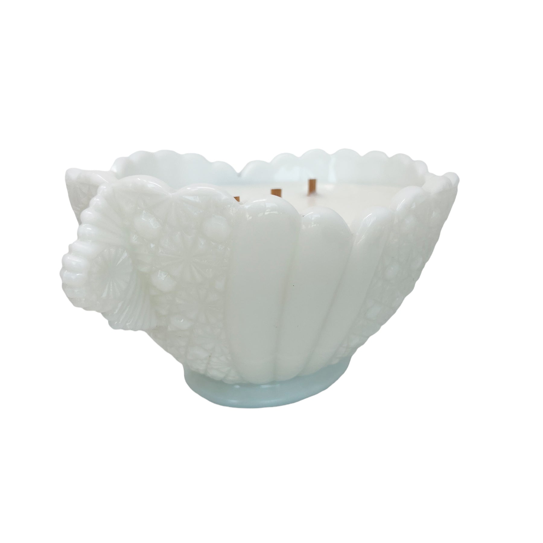 Ophelia is a stately, shapely, scalloped stunner! This large, curvy white milk glass gal is adorned with the Fenton "Daisy and Button" design that leads to a scalloped edge detail at her top. She is a pedestal piece and that's just where she belongs - on a pedestal. Ophelia measures 11" long (handle to handle) x 7" wide x 4.5" tall, dates to the 1960s, and carries a large wax-load of over 40 ounces!