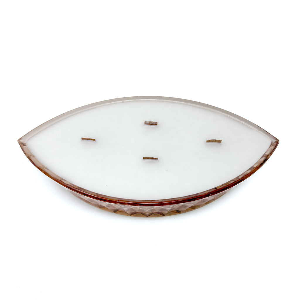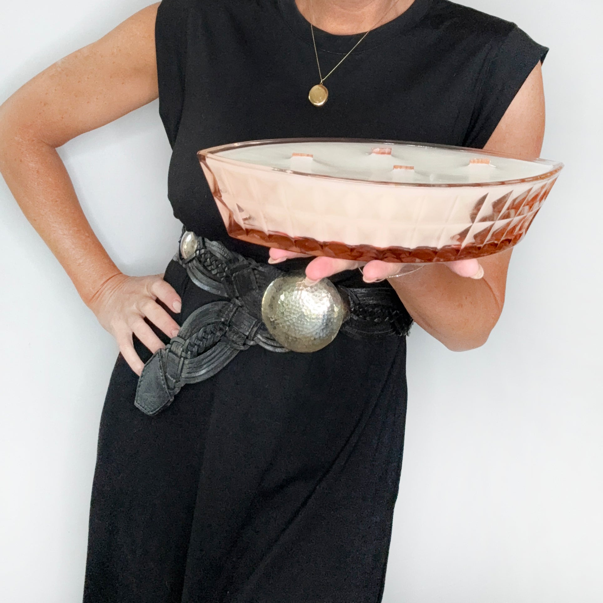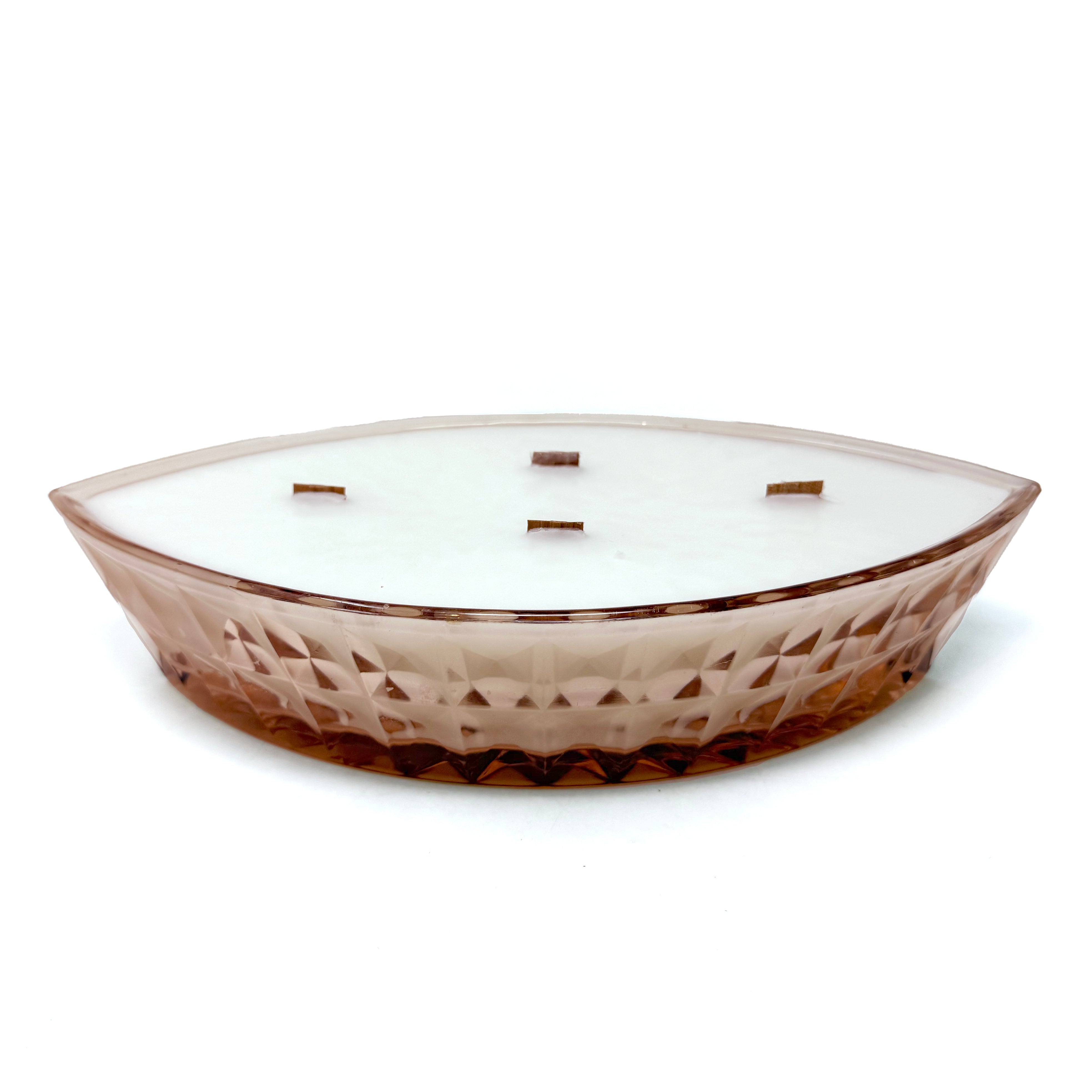 Soft pink meets bold scale in this vintage cut glass beauty—because being feminine and formidable is always in style! Deirdre dates to the 1950s and measures 12" long x 7" wide x 2.5" tall and holds a nice, large wax load making for a long burn time!