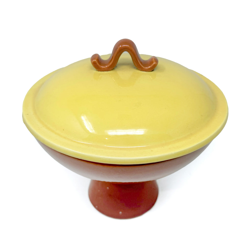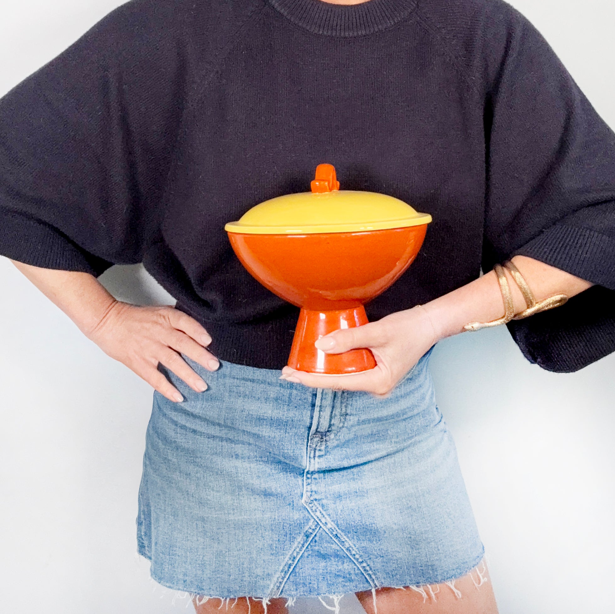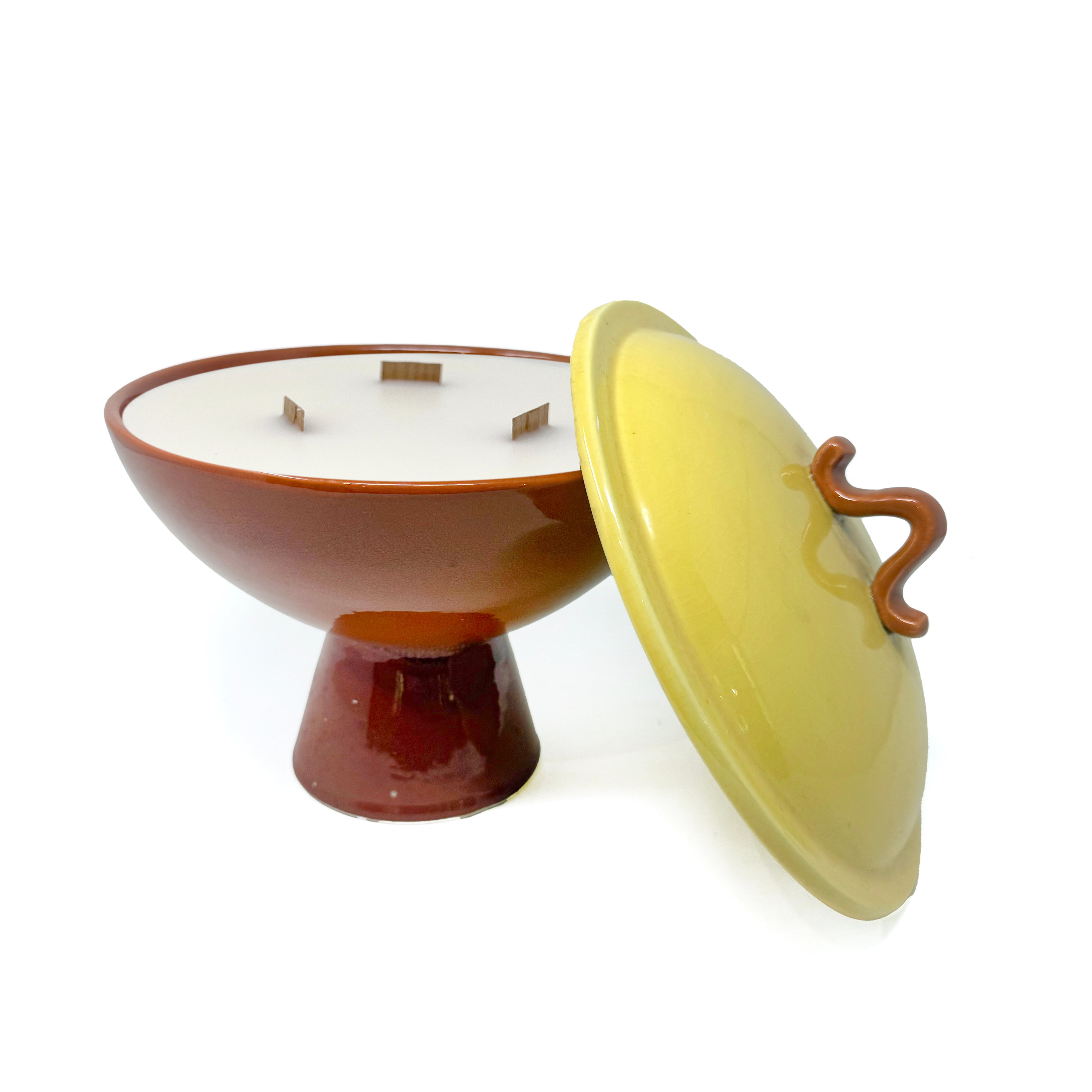 Bold, round, and unapologetically cheerful, Doris captures the optimism of the atomic age. Dory's vibrant glaze and sleek form transform a simple flame into a design-forward moment of midcentury magic! She dates to the 1950s and measures 9" tall x 8" diameter.