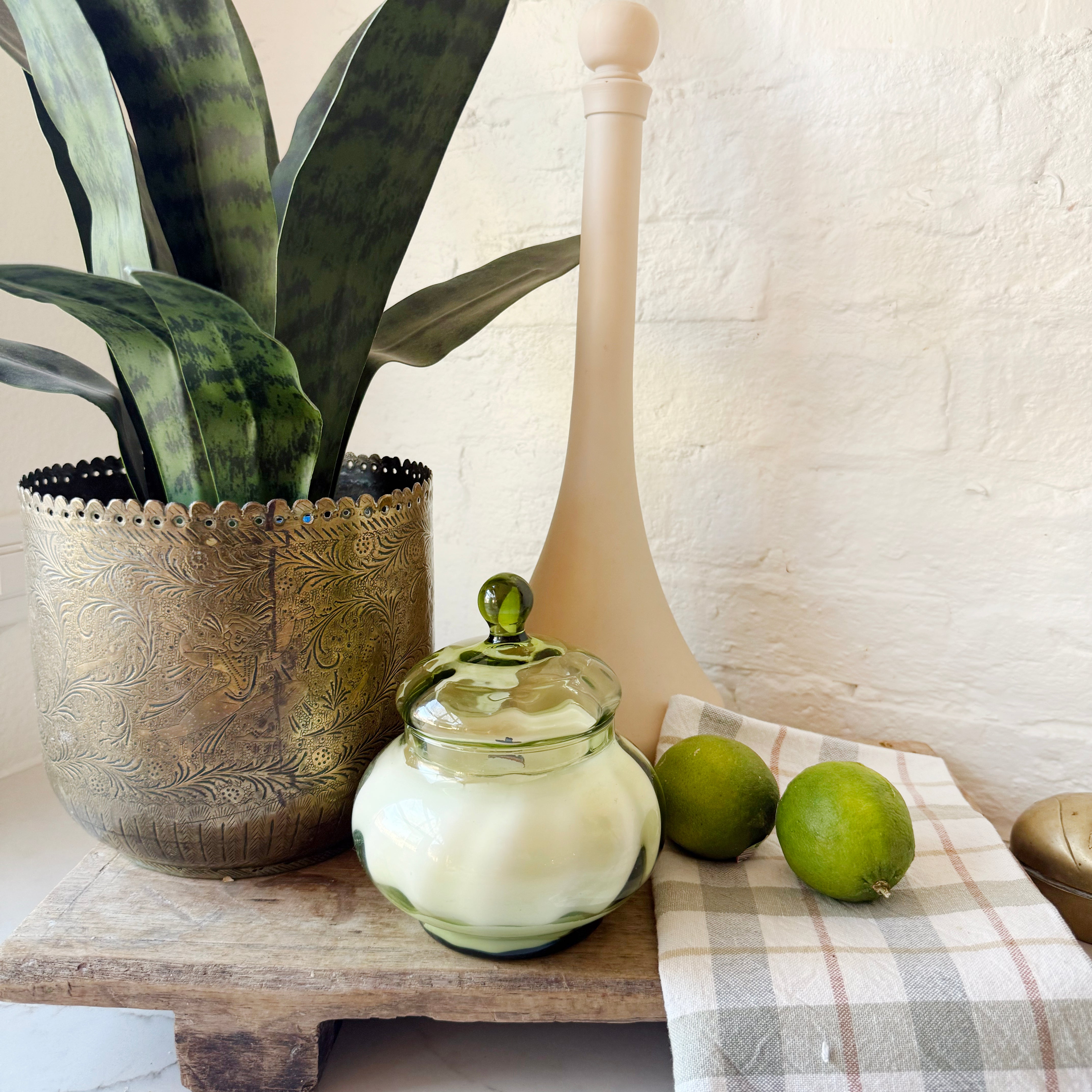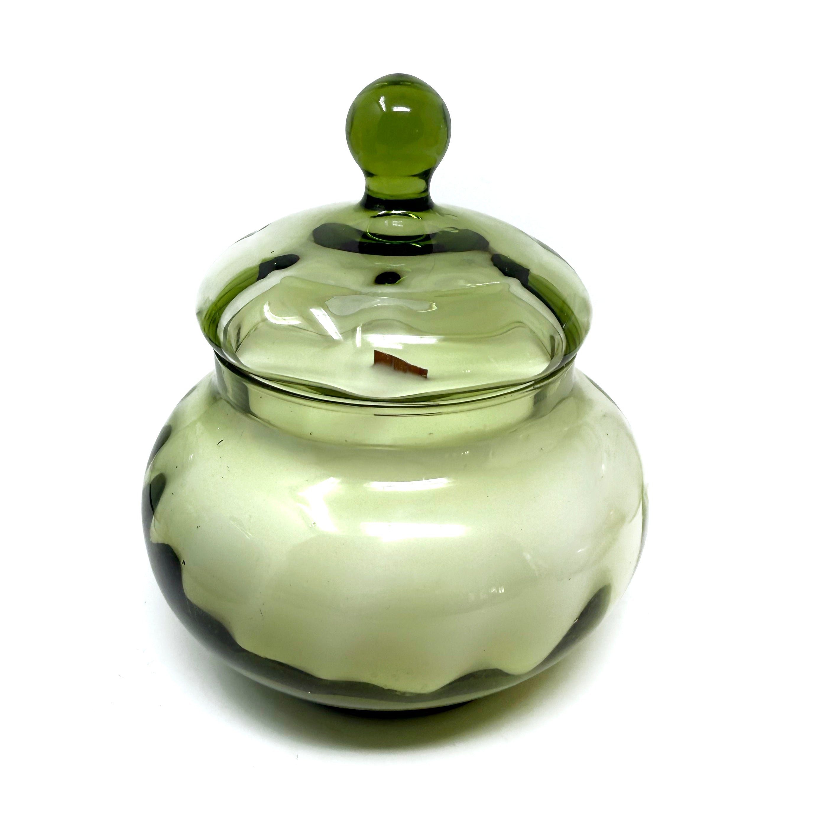 They don’t make green glass like this anymore. Dating back to the 1950s, Emma has a rich, luminous color that feels cheerful, collected, and full of personality. A true reminder that great design always sticks around! Emmie dates to the 1960s and measures 4.5" diameter x 5.5" tall (lidded).