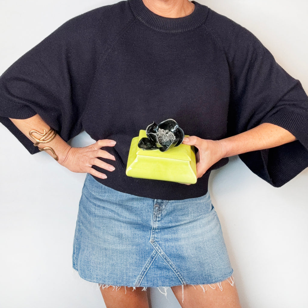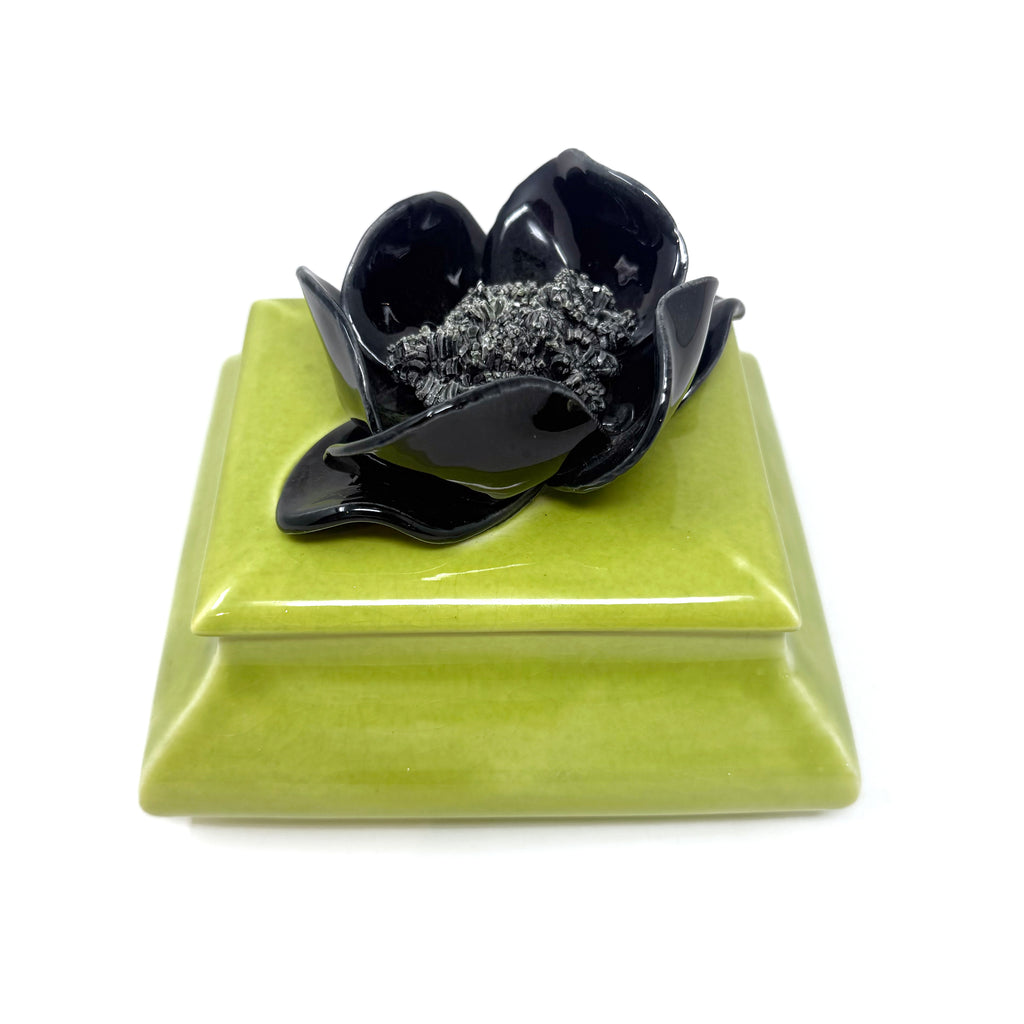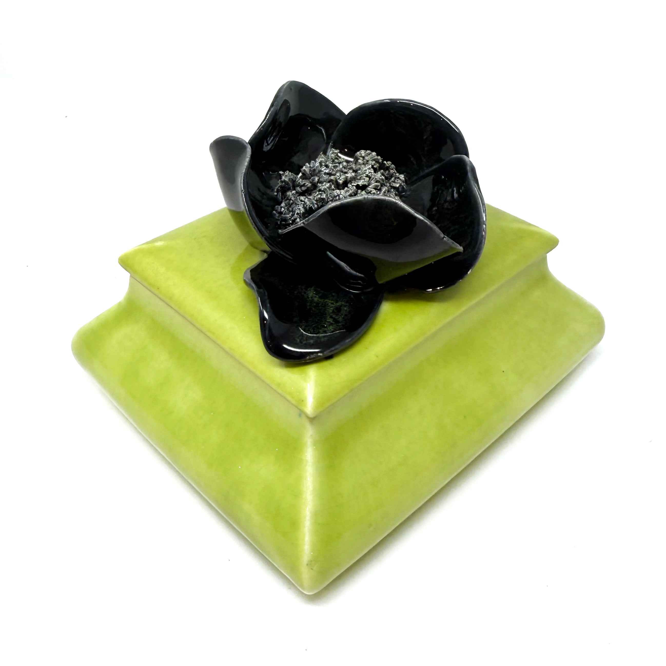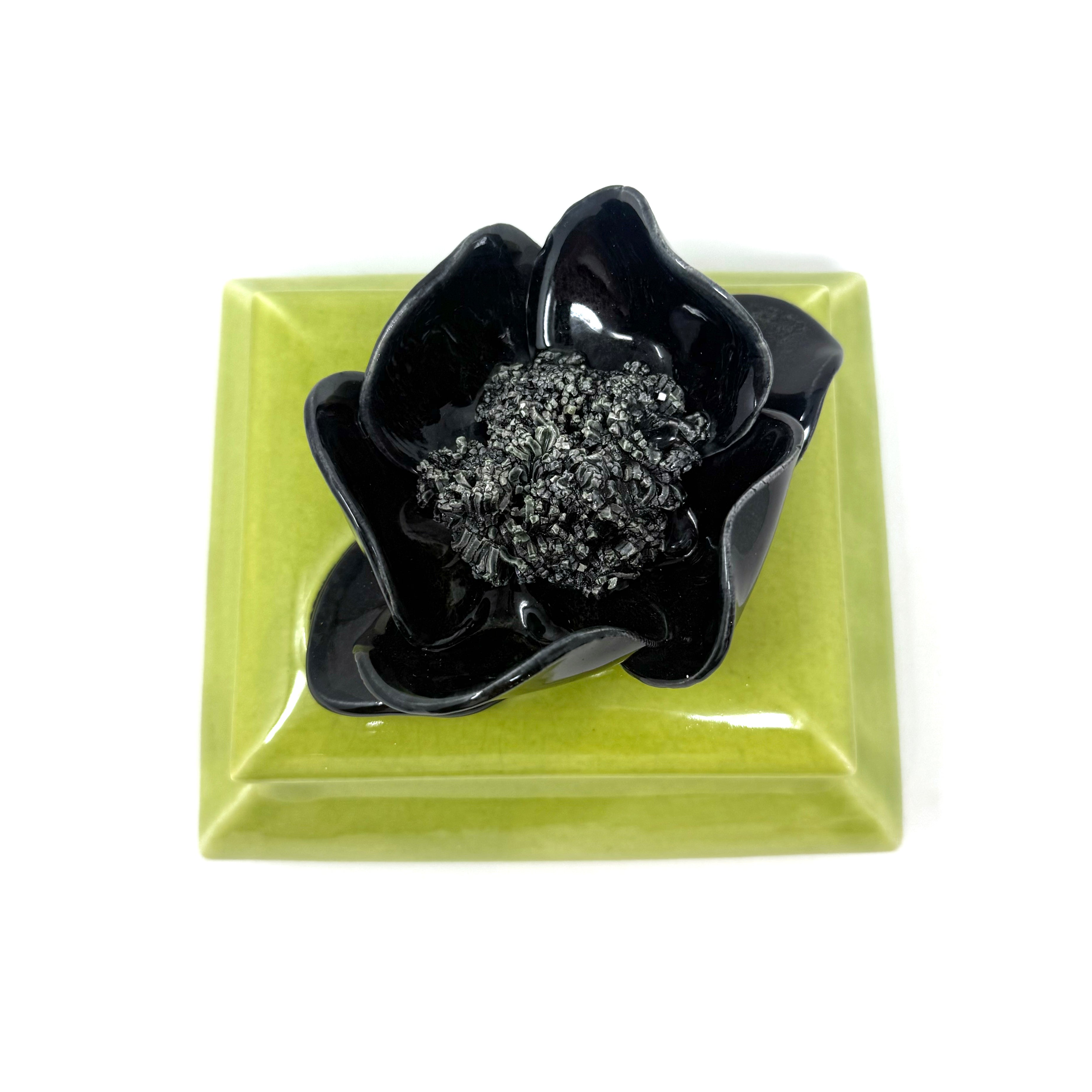 With her glossy lime glaze and moody black flower, Miss Gloria walks the line between organic and architectural. It’s the kind of midcentury accent that feels effortless yet intentional! She dates to the 1950s and measures 4.5" tall x 5" wide x 6" long.