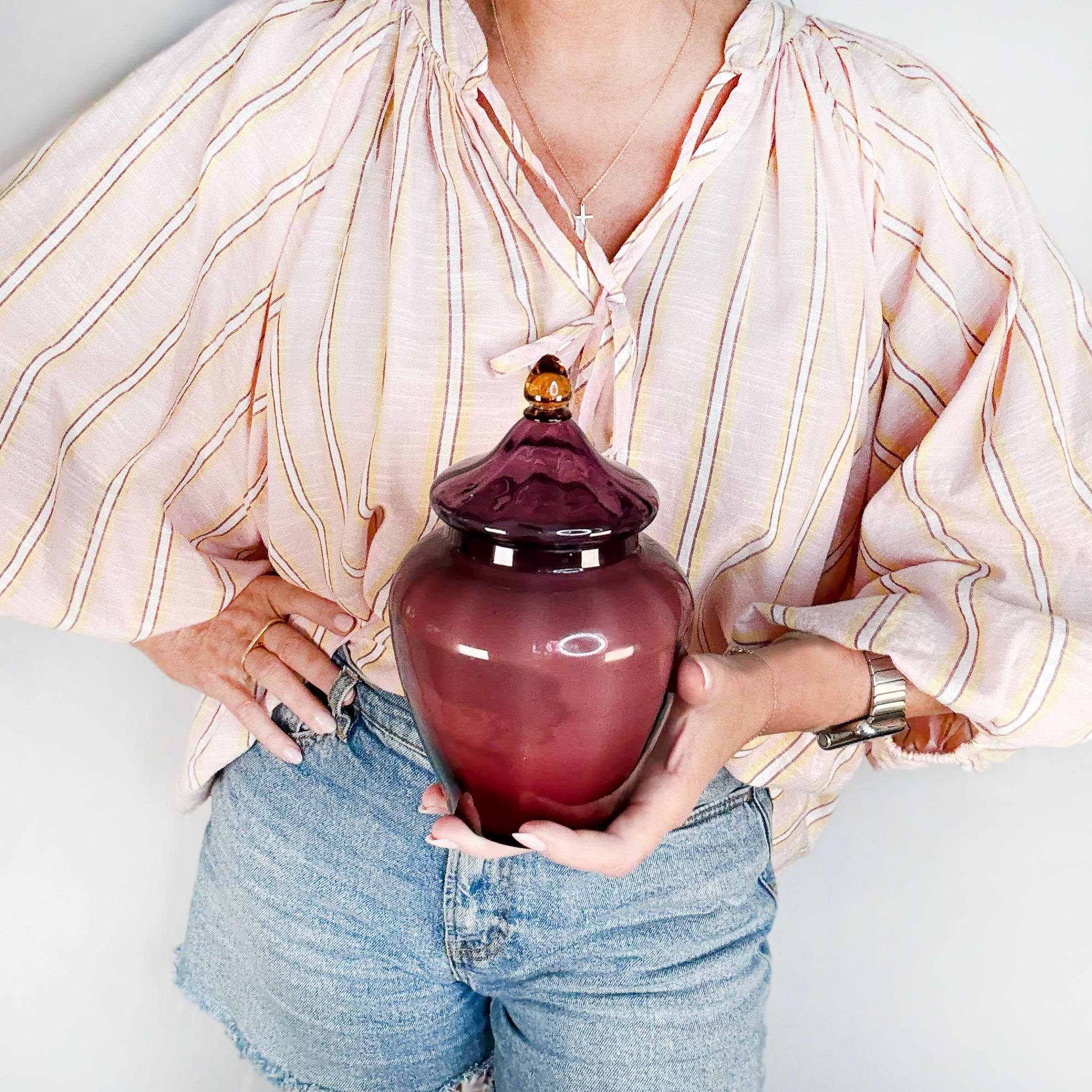 Jasmine is the plum Empoli depression glass of our dreams! Her sweet stature, simple design and marigold finial lid have us all giddy inside! She’s chic and and stylish and makes a great addition to any glass collection. She measures 5” diameter x 8.5” tall (lidded) and dates to the 1960s.