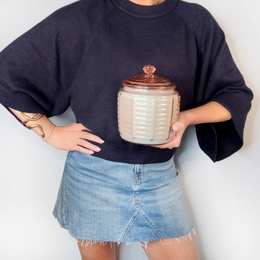 Marguerite is playful, dramatic, and effortlessly chic — a large ribbed glass beauty straight from the 1950s. She makes spaces feel curated, sophisticated, and just a little bit magical! She measures 7.5" tall x 6" diameter.