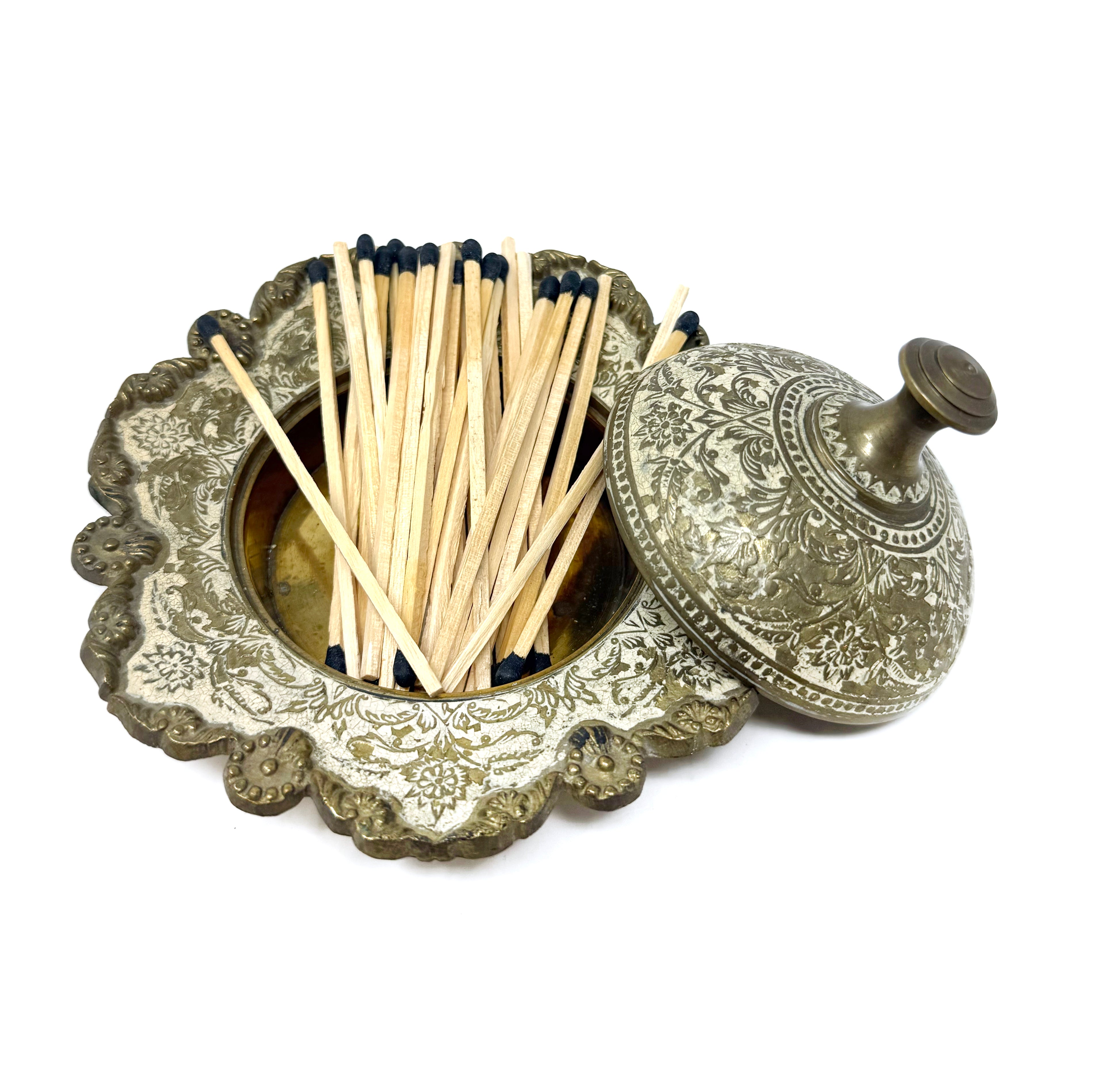 With her intricate Indian motifs and rich golden patina, Miss Nina looks like she could have sparked stories as well as flames! She dates to the 1960s and comes with a spare set of matches and a "strike anywhere" surface on her base.