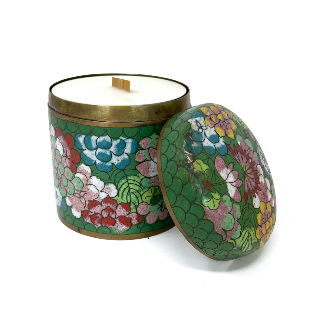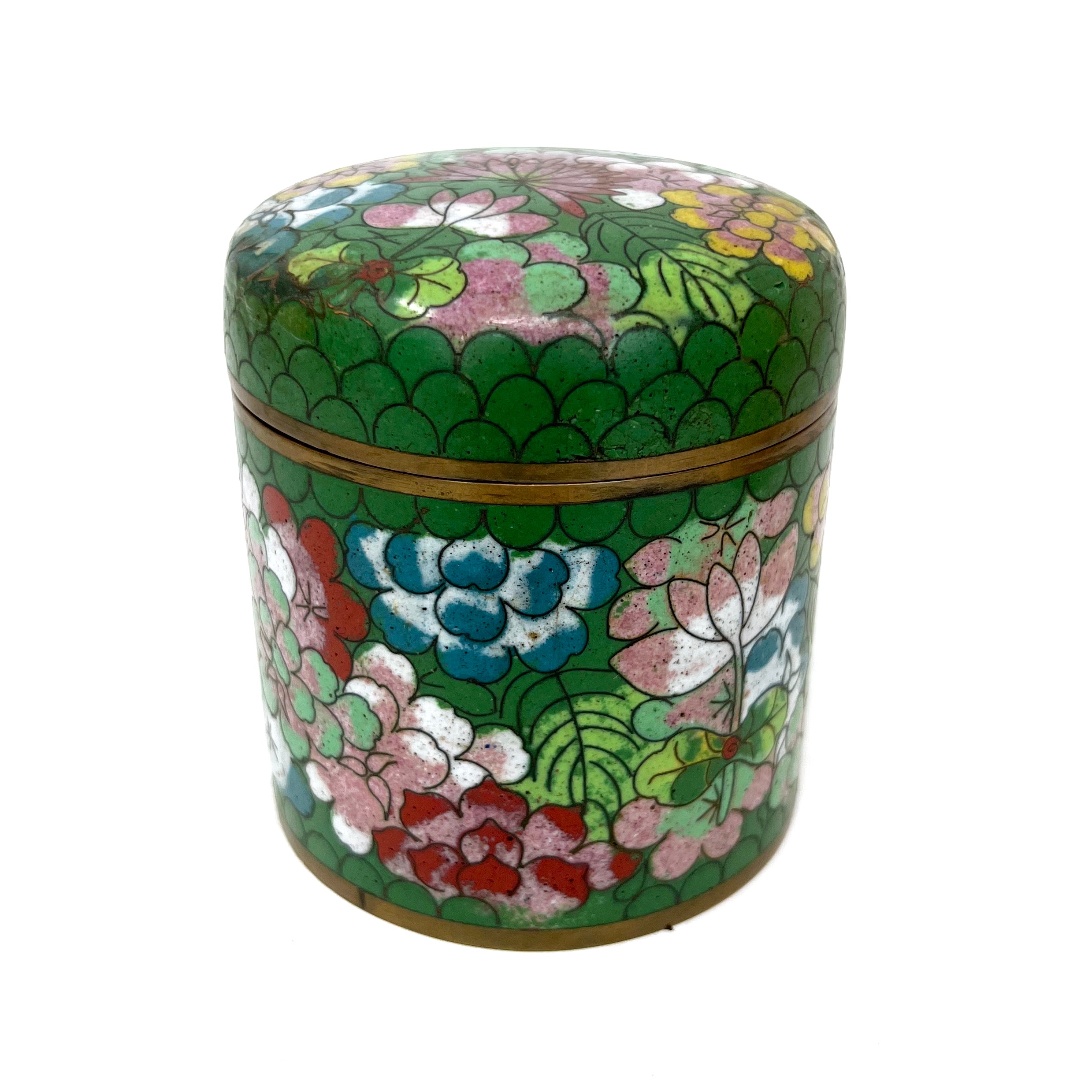 Oh Rajah … we can't get enough of your emerald cloisonné with turquoise scallop trim and floral detail! Dating back to the early 1900s, Rajah has some expected vintage wear (lending to her beauty) and measures 3" diameter x 3.5" tall (lidded). Get her before she's gone ... or before one of us keeps her. ;)