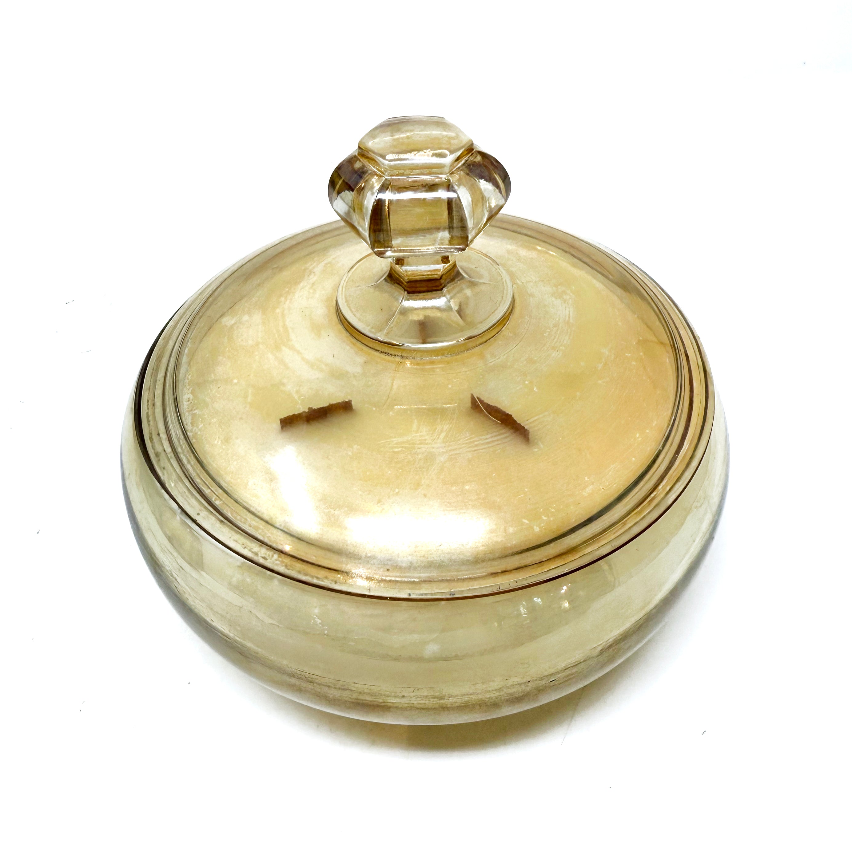 Reba is the an incredible piece of Carnival glass, dating to the 1960s - an extremely fun find! She has the most stunning iridescence and will shine on any shelf. Reba measures 5" diameter x 7.5" tall (lidded).